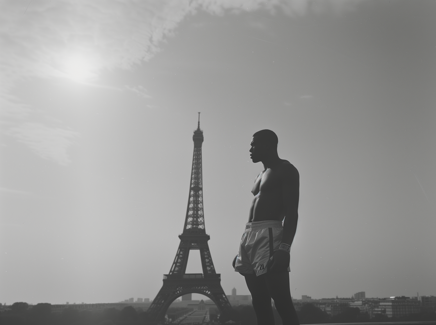 Black and white photo of a boxer in front of the Eiffel Tower, creating a dramatic silhouette against the bright sky.