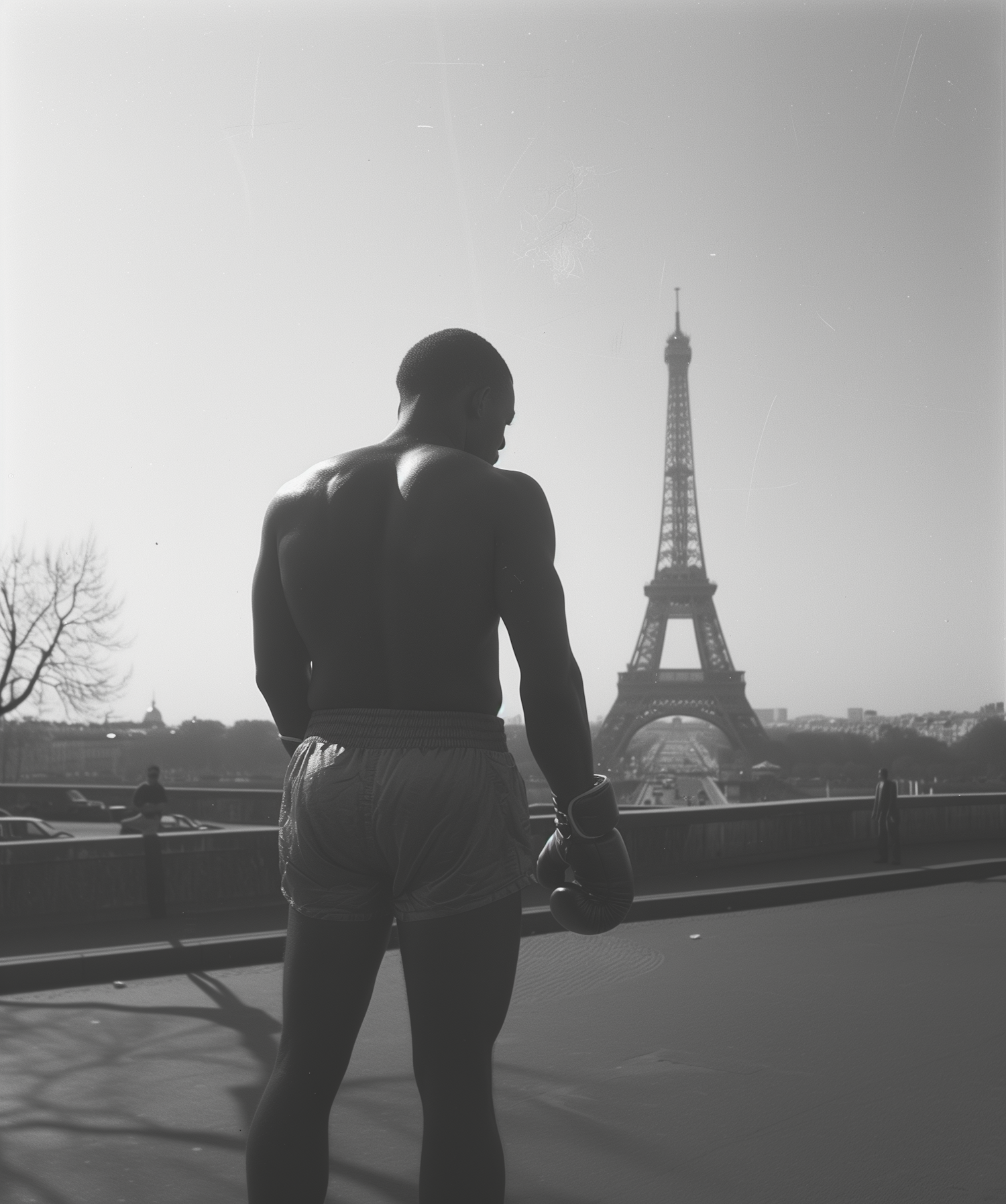 A black man with boxing gloves stands on a rooftop, gazing at the Eiffel Tower. Black and white photo capturing strength and contemplation.