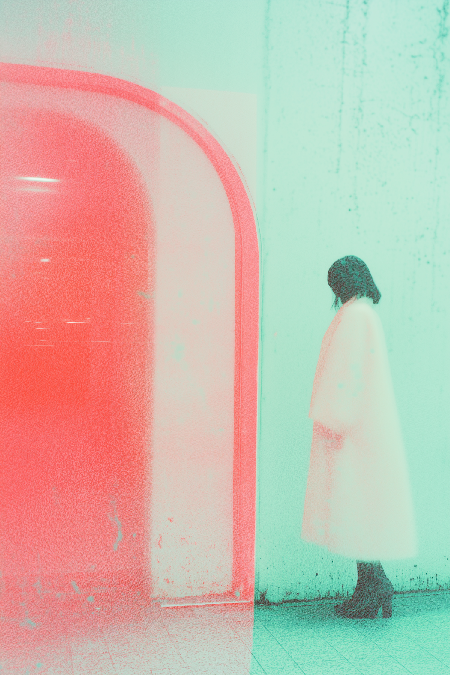 Surreal pastel scene with a person in a long coat, standing by an arched doorway. Dreamlike colors and soft lighting create a hazy effect.