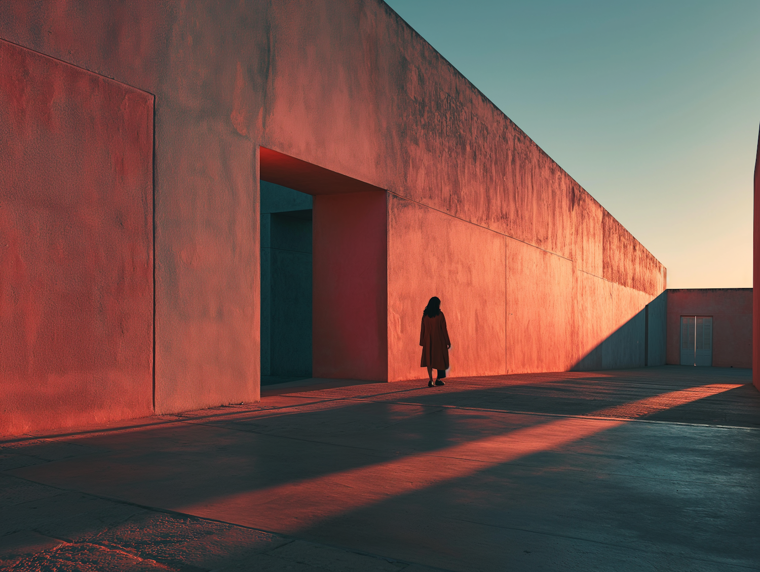 A solitary figure walks through a minimalist architectural space bathed in warm, reddish light, creating a serene and introspective scene.