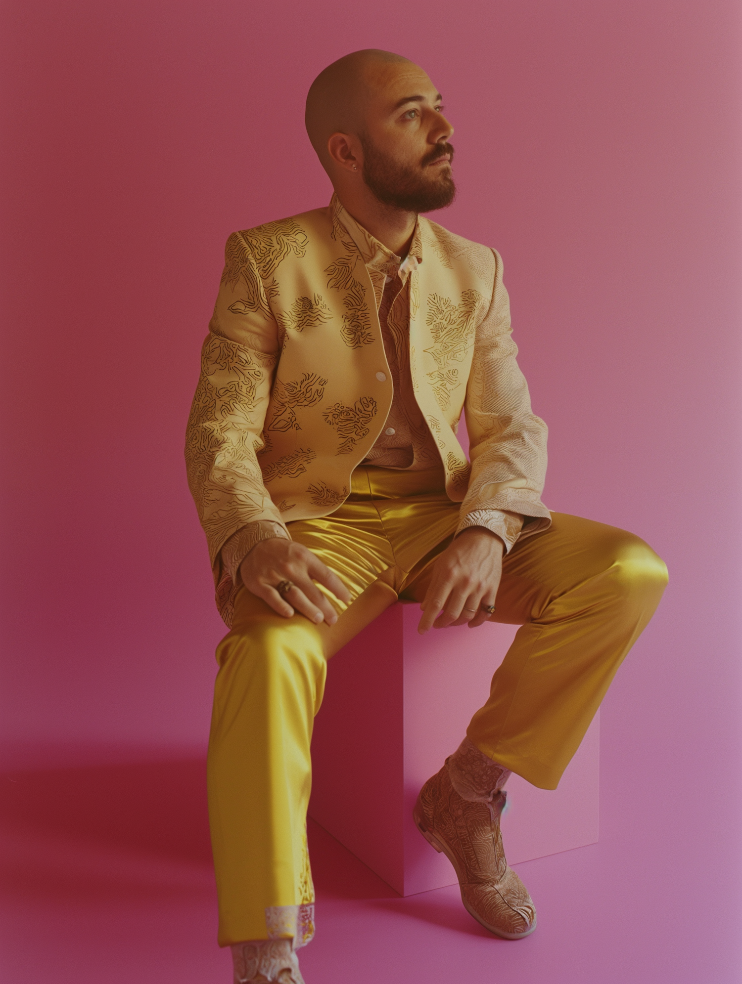 Stylish individual in a yellow embroidered suit sits on a pink cube, set against a vibrant pink background. Fashion-forward and bold.
