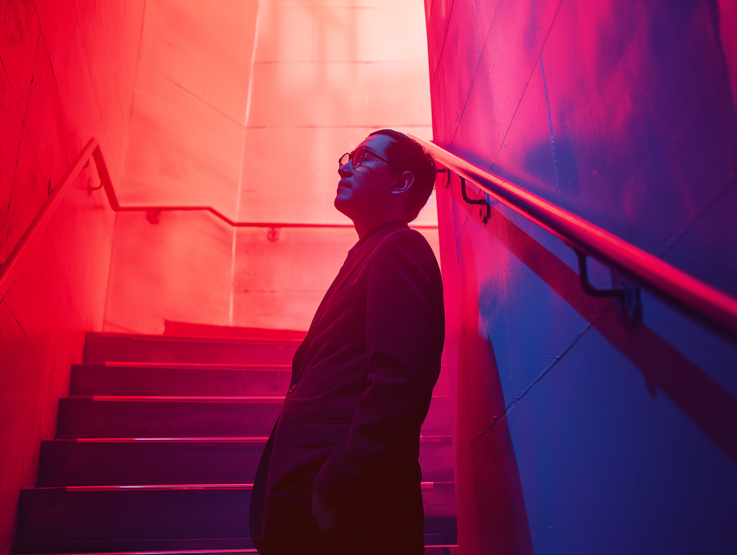 Man in a dark suit stands on a staircase, illuminated by vibrant red and purple lights, creating a dramatic and contemplative scene.