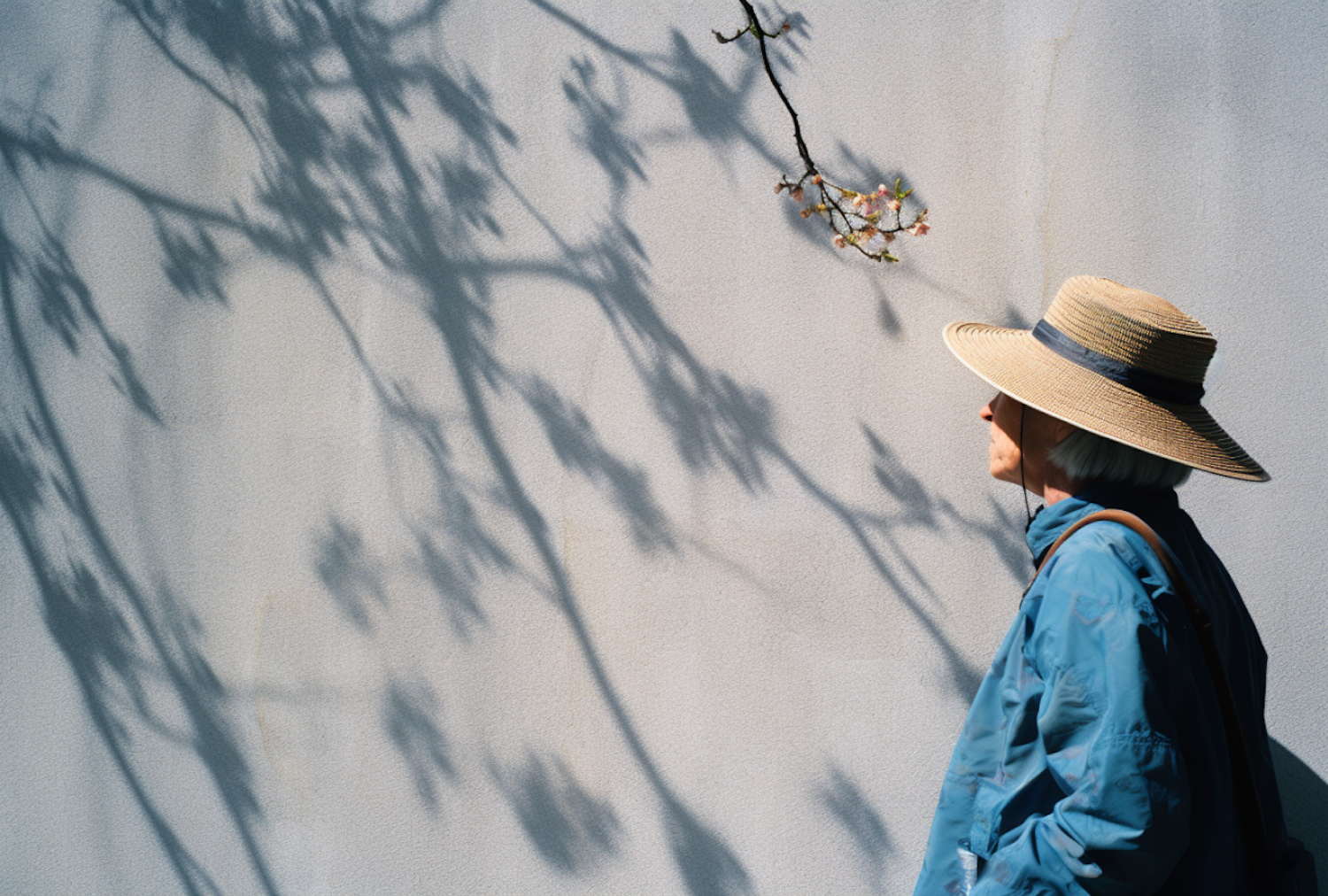 Person in straw hat and blue jacket stands against a wall with tree shadows and blossoms, creating a serene, artistic scene.
