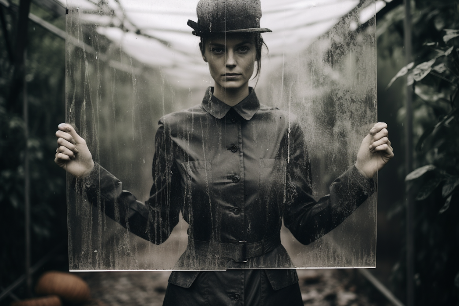 Woman in a greenhouse holding a foggy glass pane, wearing a dark coat and hat, surrounded by lush greenery.