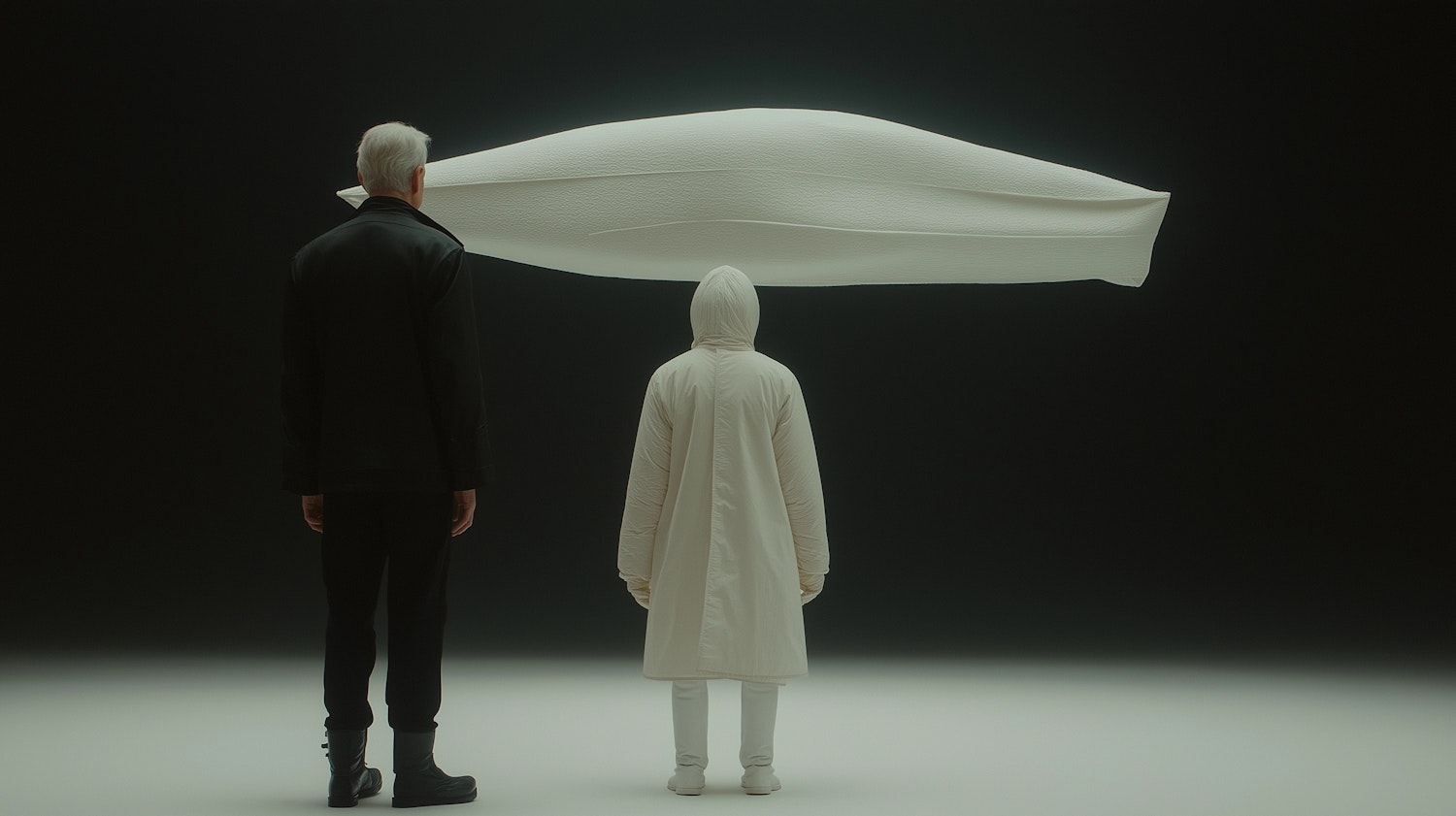 Surreal scene with two figures in contrasting black and white outfits, observing a floating white object in a minimalist setting.