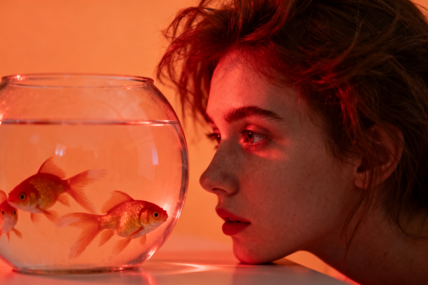 A young woman with auburn hair gazes at a fishbowl with goldfish, illuminated by warm orange-red lighting, creating an intimate scene.