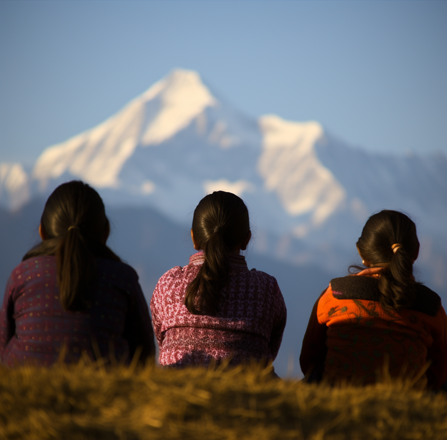 Three people sit facing a snow-capped mountain, wearing colorful jackets, with a foreground of golden straw under a clear blue sky.