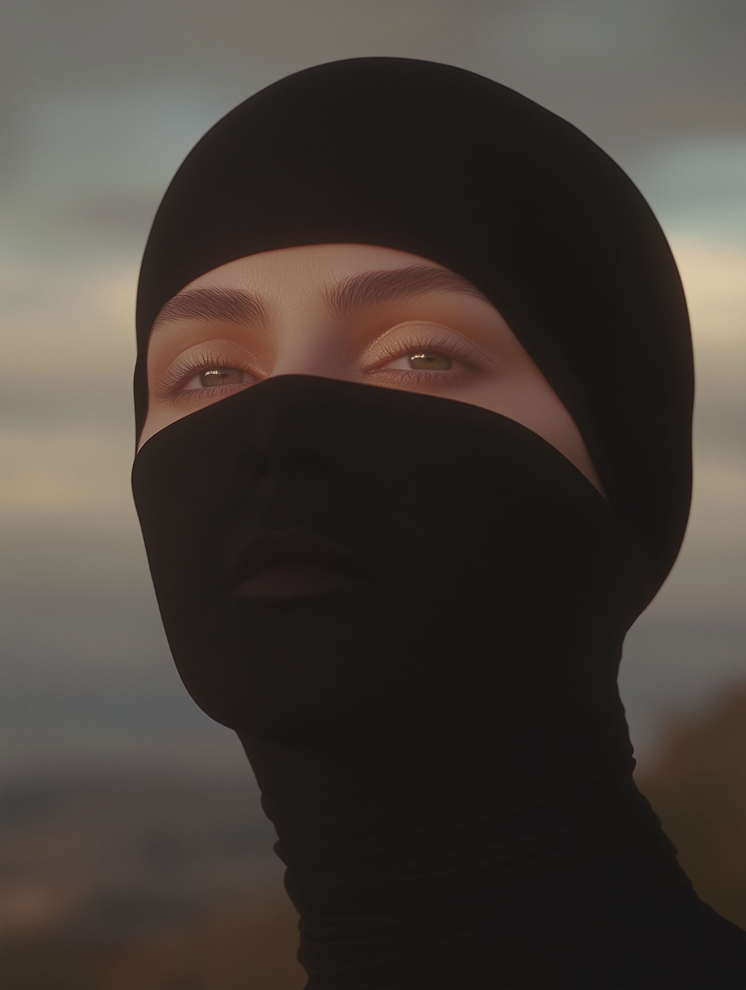 A mysterious figure with green eyes in a black face covering against a soft, muted background.