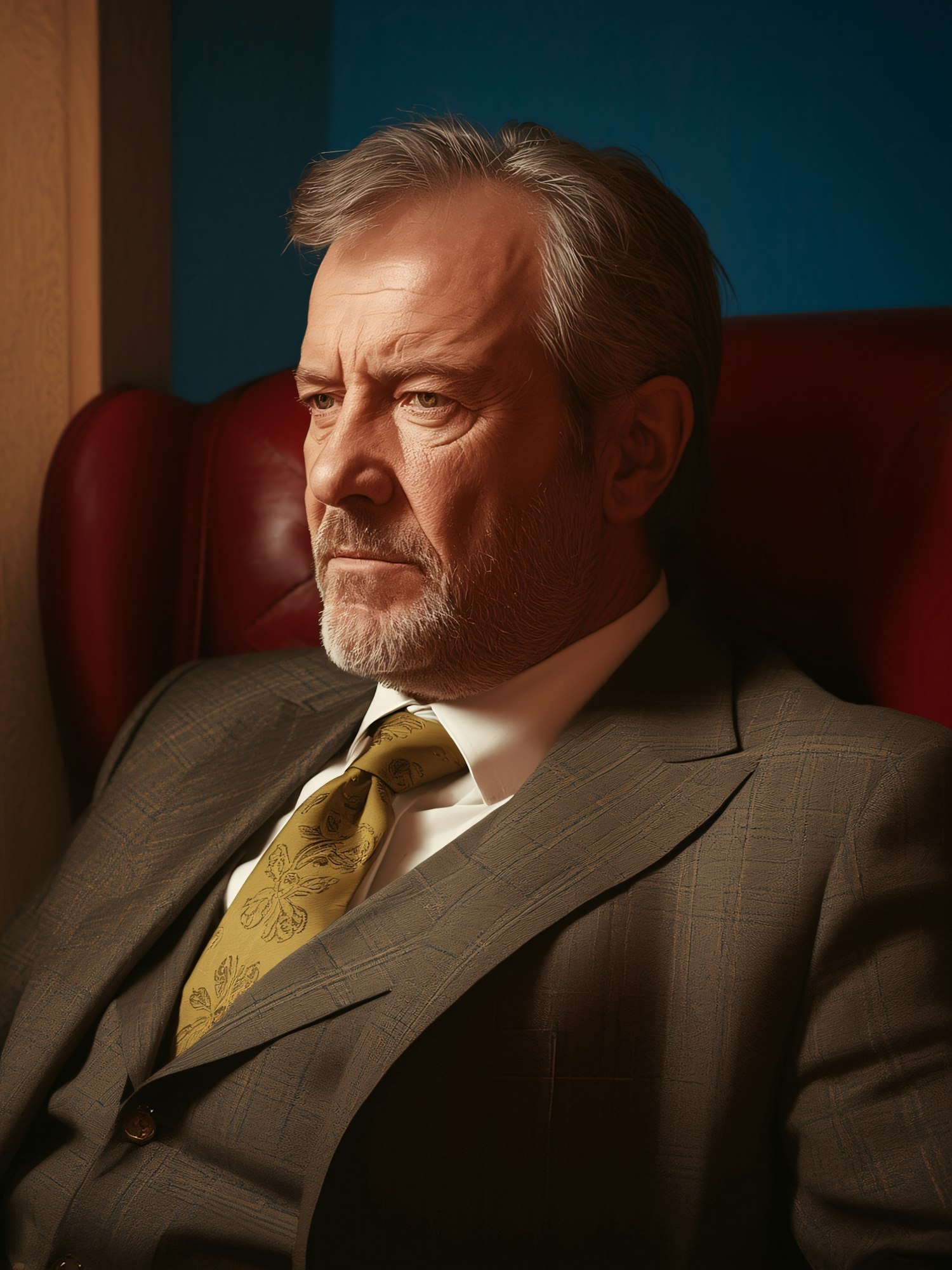 A mature man in a brown plaid suit and yellow tie sits in a red chair, exuding a thoughtful and composed demeanor.