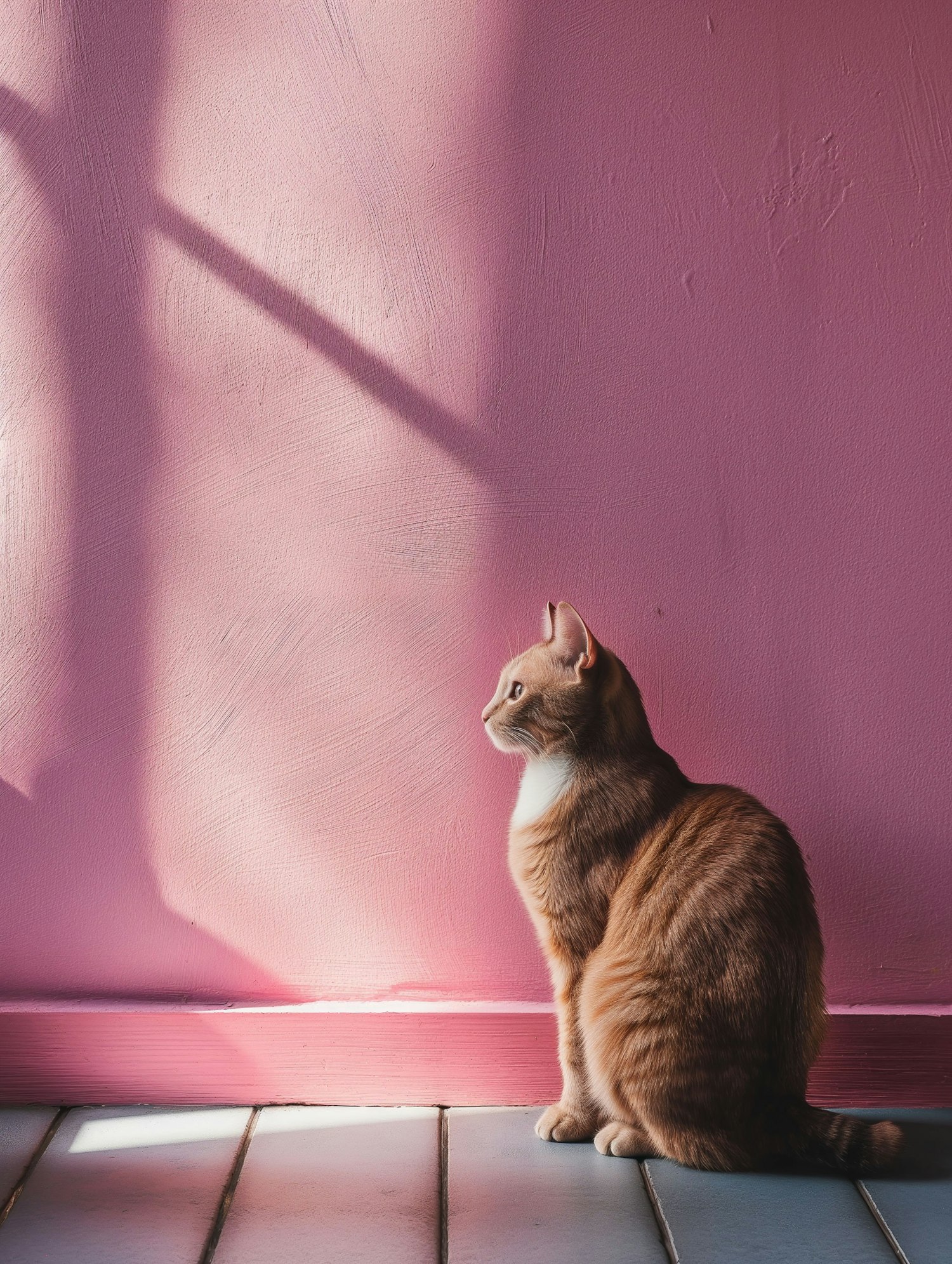 Ginger tabby cat sitting against a pastel pink wall, bathed in soft sunlight. Elegant and serene scene with warm tones.