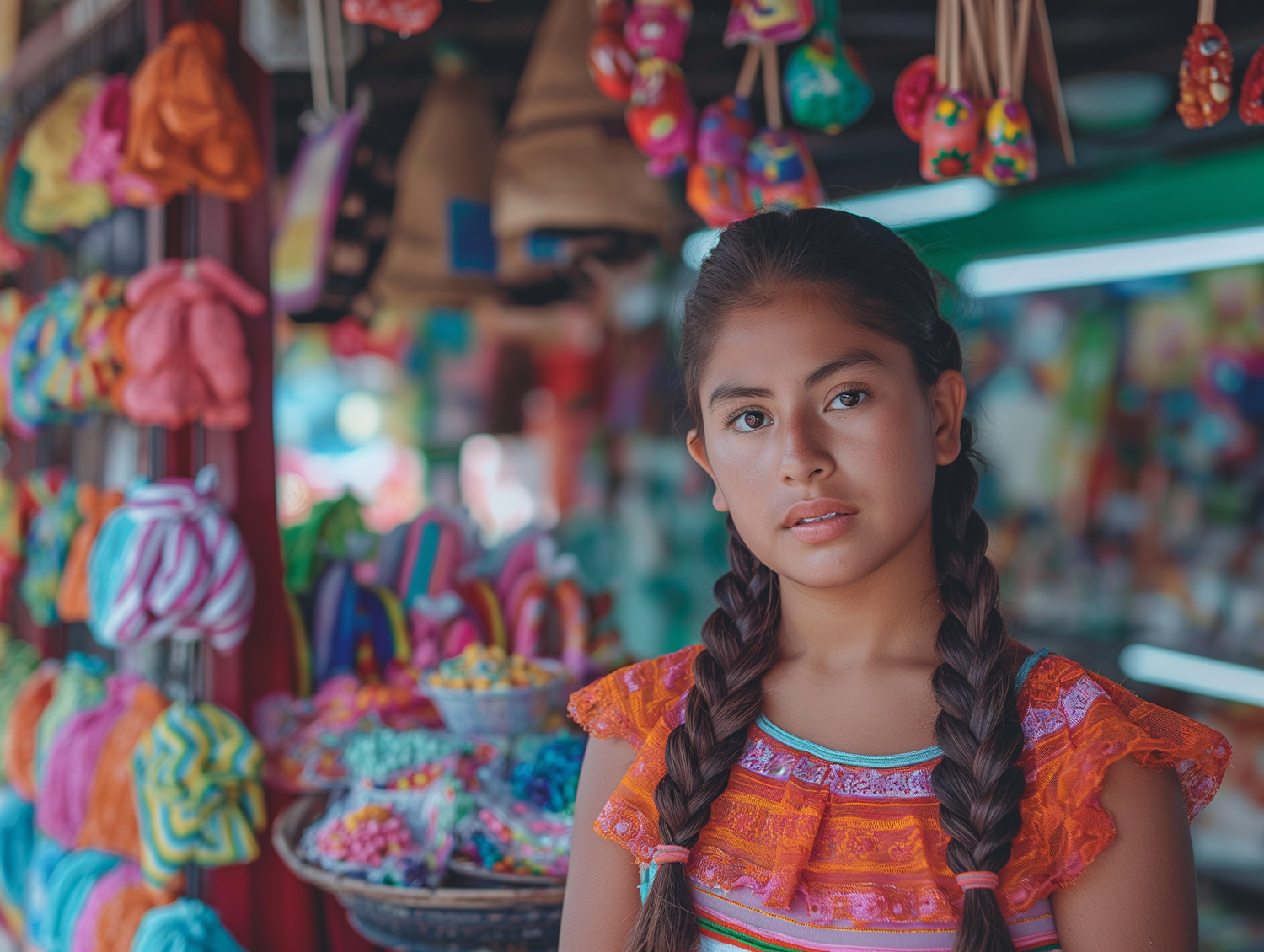Young girl in a vibrant market, wearing a colorful dress, surrounded by colorful crafts and textiles, creating a lively scene.
