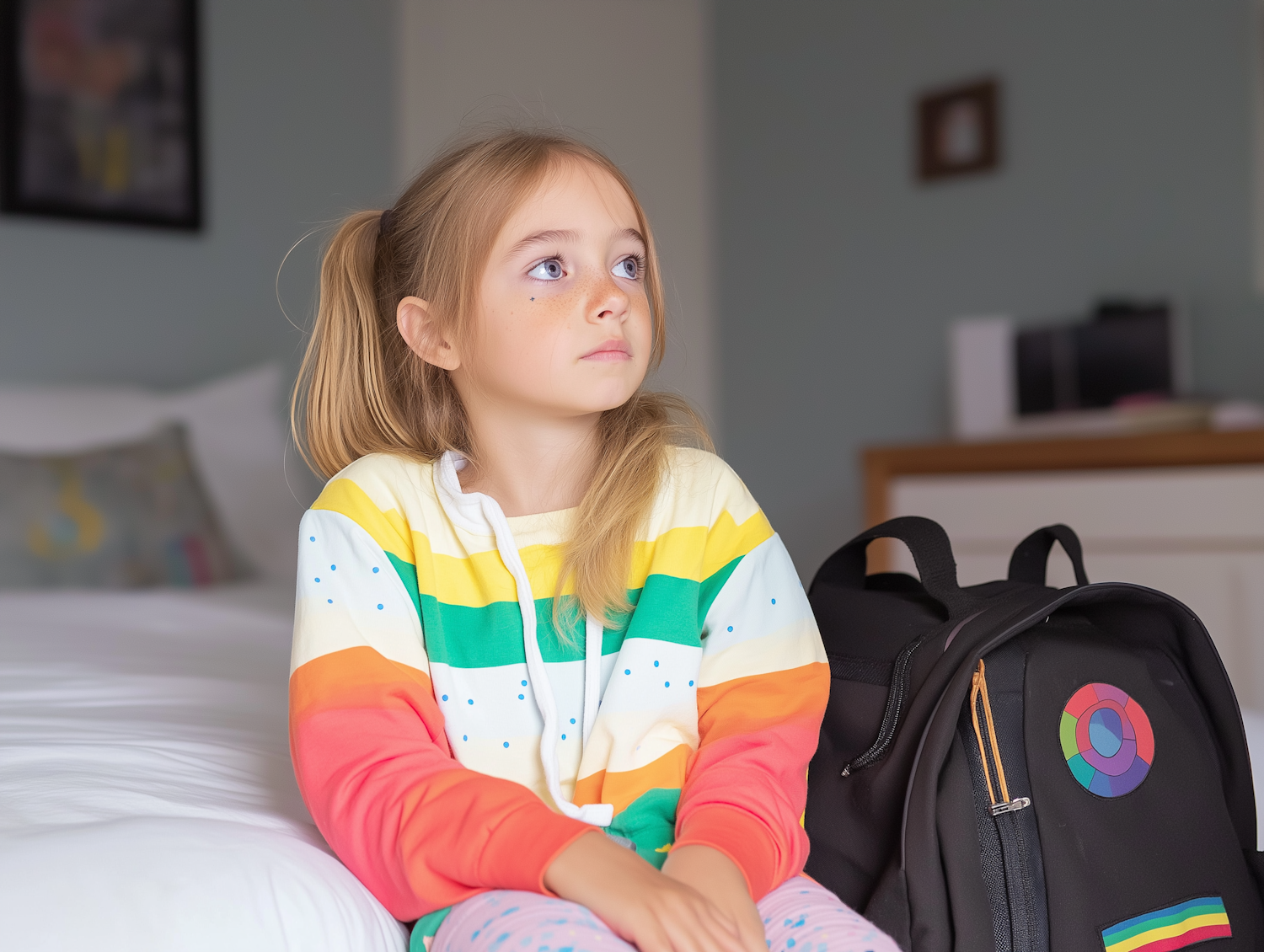 Young girl in colorful hoodie sits on bed with backpack, looking thoughtful. Cozy indoor setting with soft lighting.