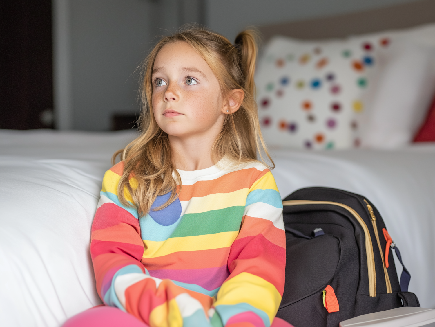 Young girl in a colorful striped sweater sits on a bed with a backpack, looking thoughtful. Bright and playful room setting.