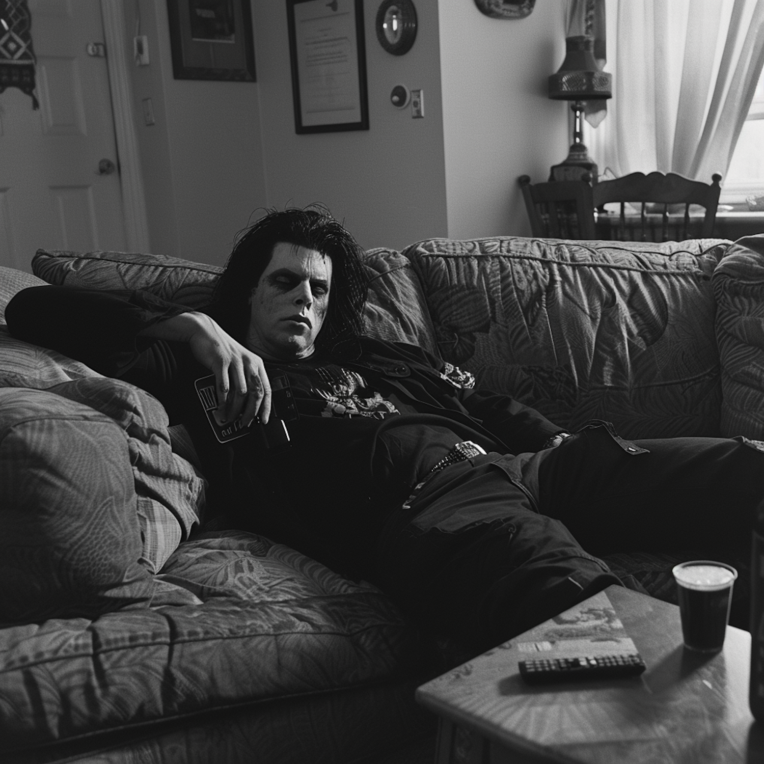A person in a dark uniform with patches lounges on a couch, holding a drink. A remote and cup sit on a table in a softly lit room.