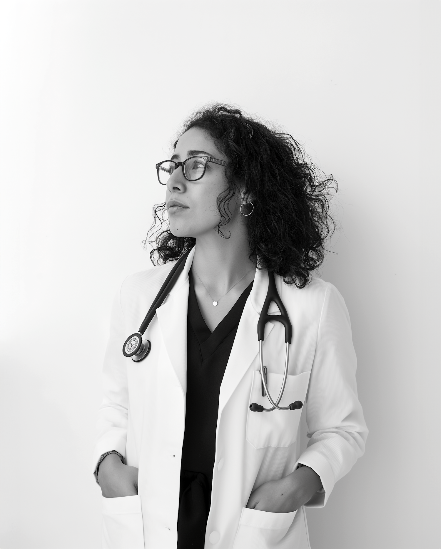 Confident female doctor in a white coat with stethoscope, gazing thoughtfully. Monochrome portrait with a professional vibe.