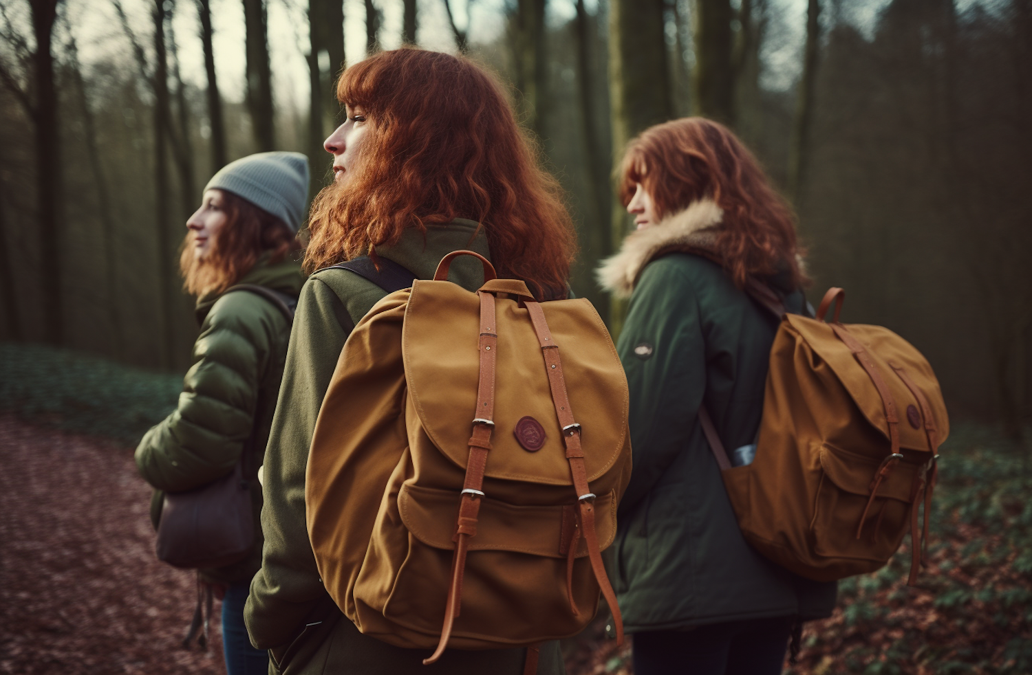 Three women with red hair and tan backpacks hike through a forest in autumn, wearing green jackets and exploring the natural surroundings.