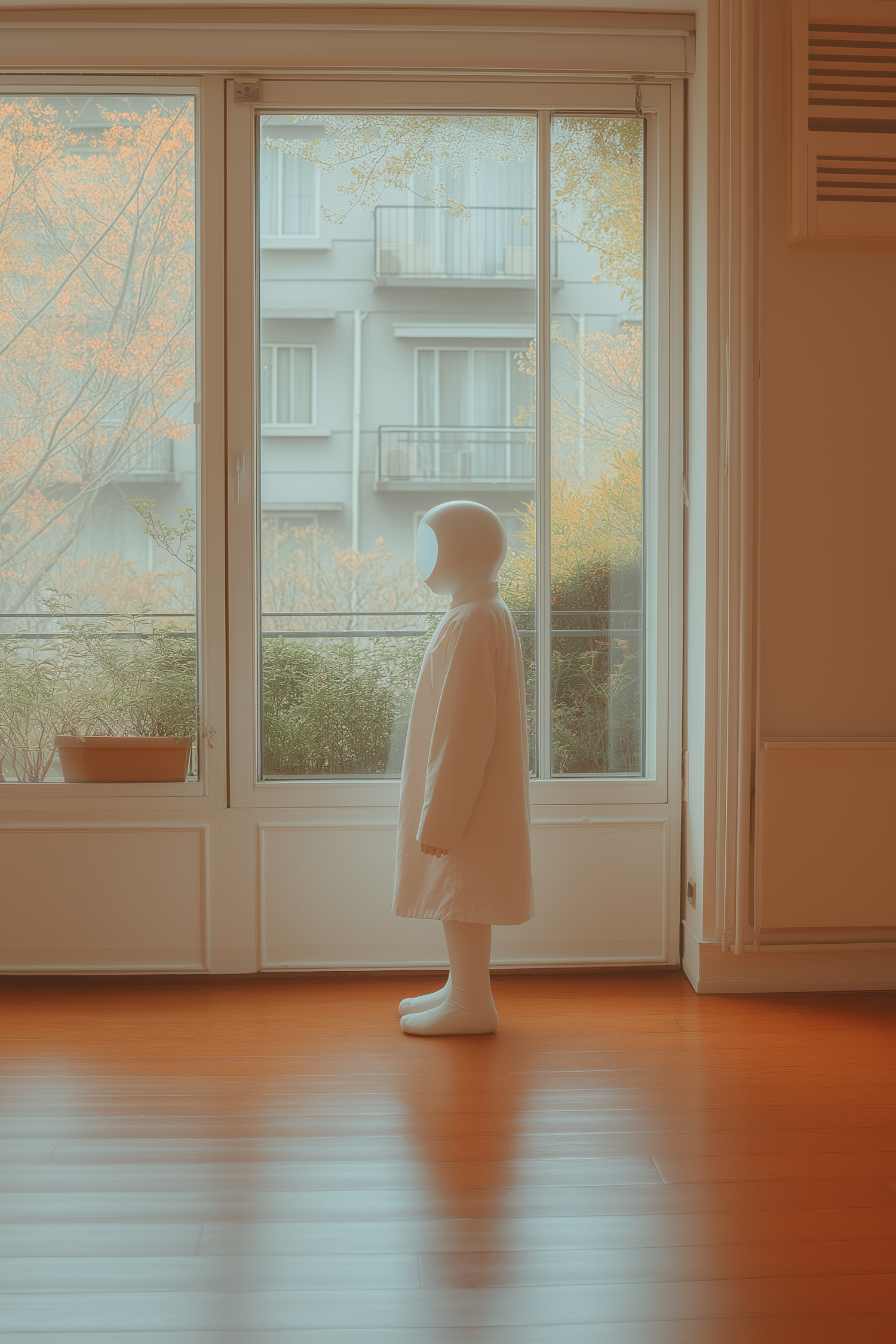 Minimalistic scene of a humanoid figure in white near a window with autumn trees and warm wooden flooring indoors.