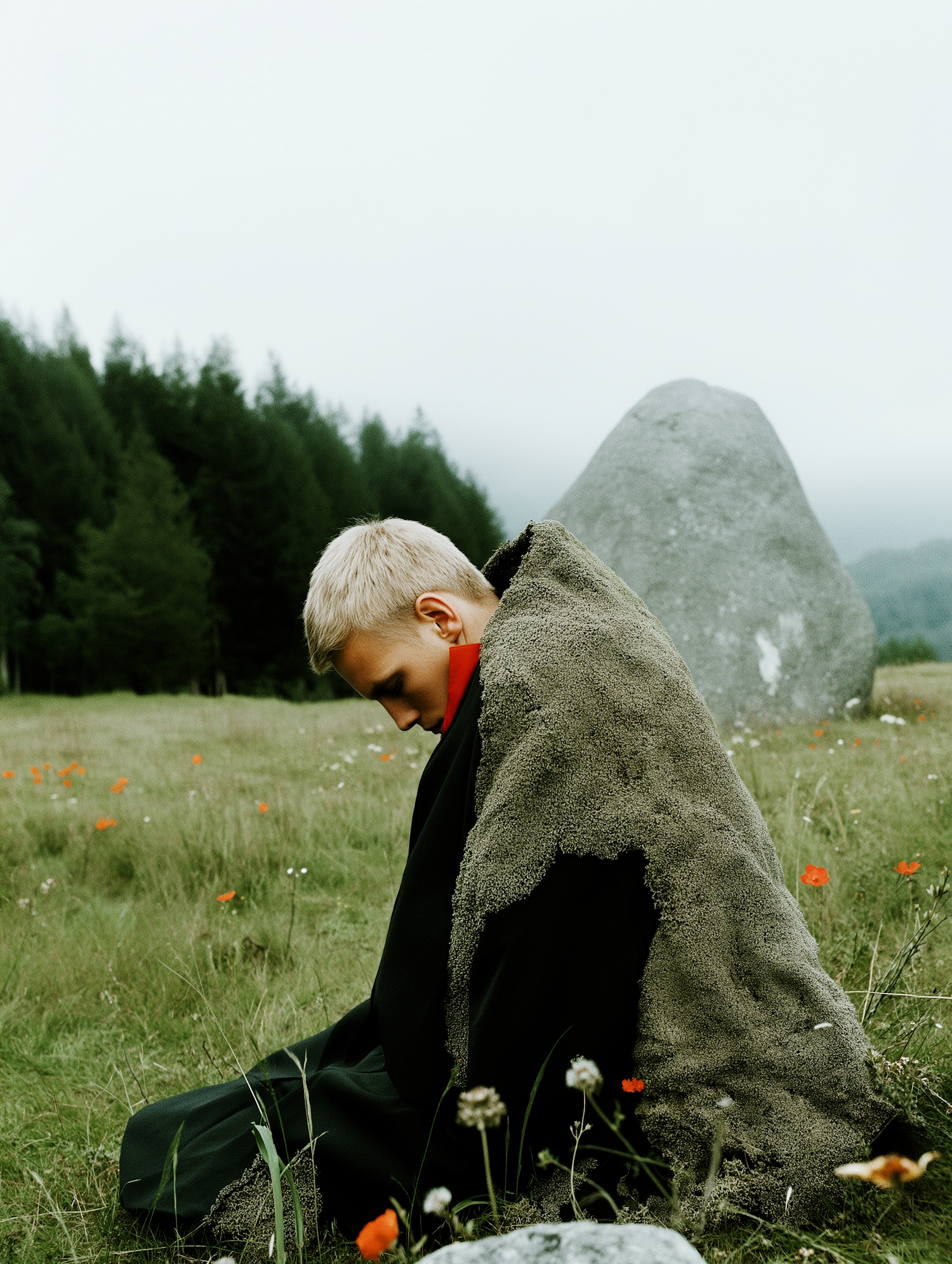 Person with blonde hair in a textured cloak sits in a grassy field with wildflowers and a large stone, under a cloudy sky.