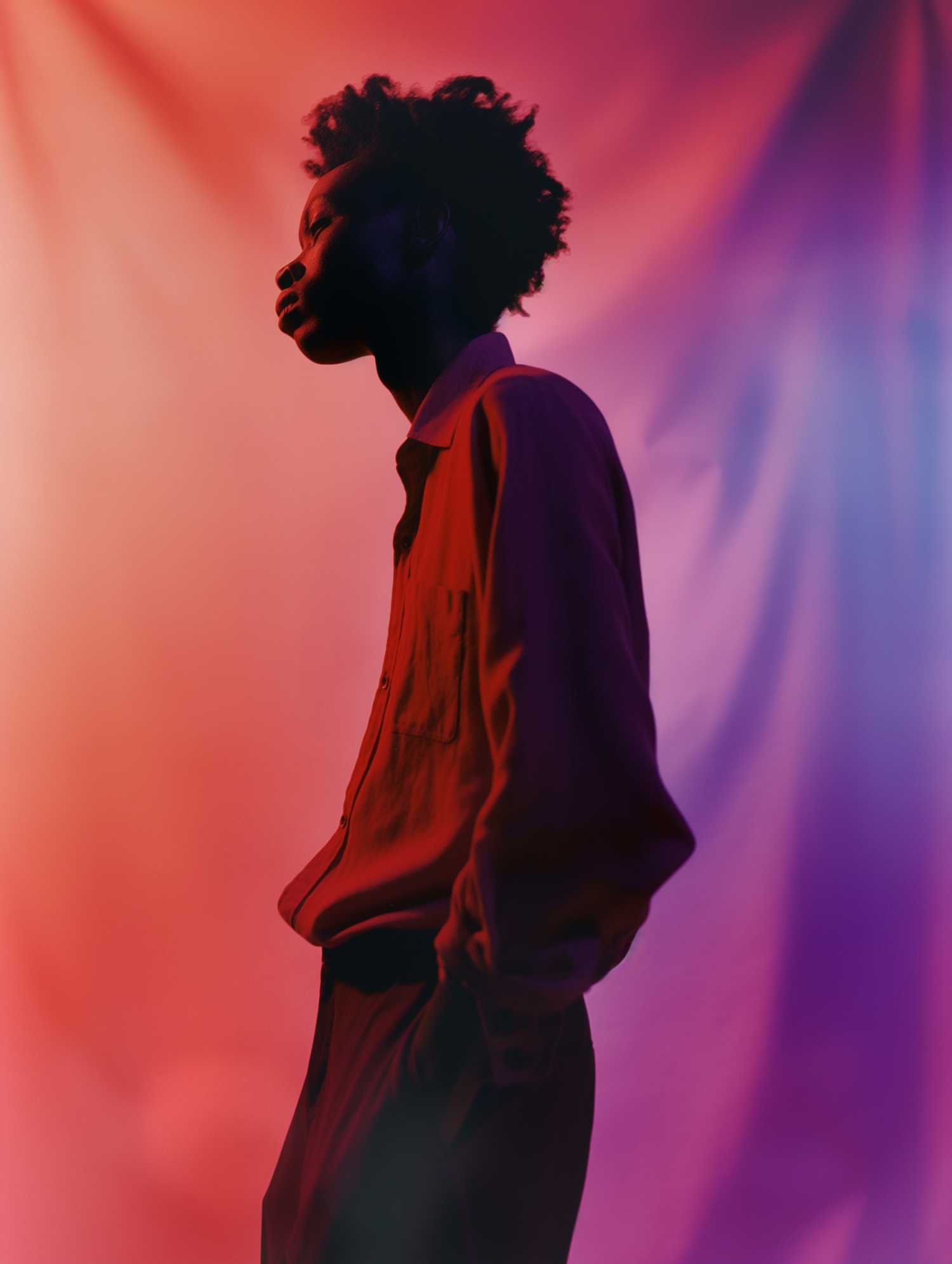 Profile of a young man against a vibrant red and purple gradient background, creating a striking silhouette effect.