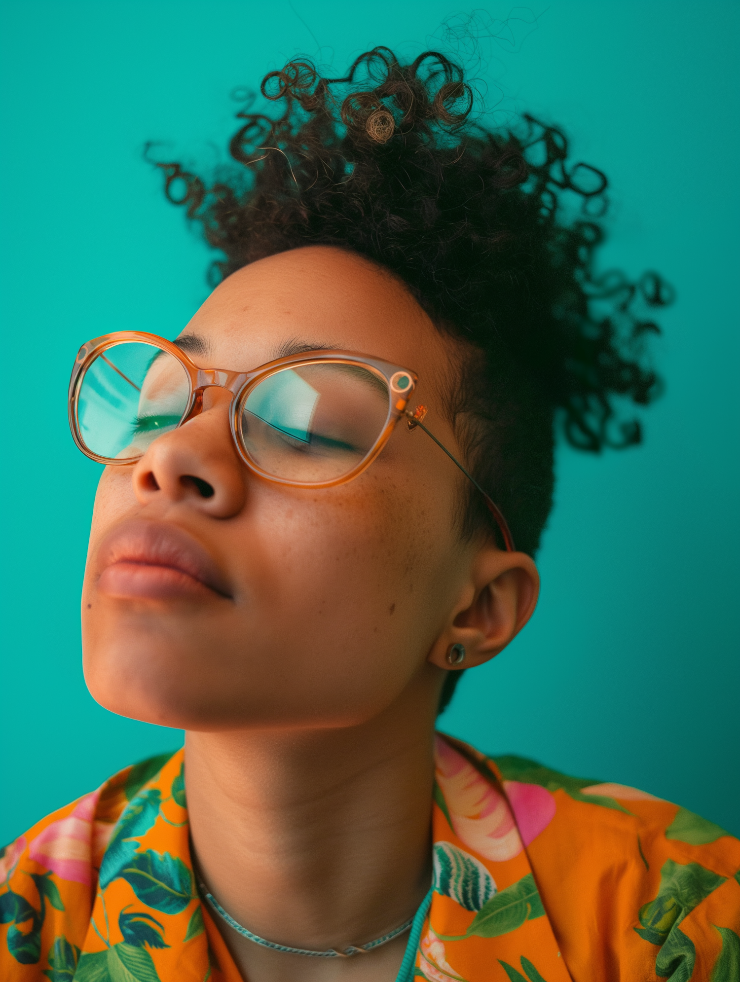 Close-up portrait of a person with curly hair, wearing glasses and a floral shirt, set against a vibrant teal background.