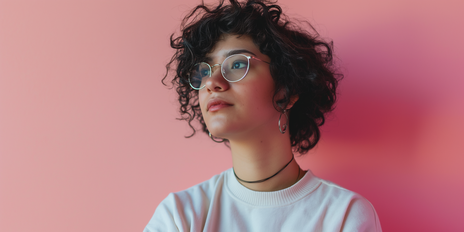 Young woman with curly hair and glasses against a pink background, wearing a white sweater and black choker.