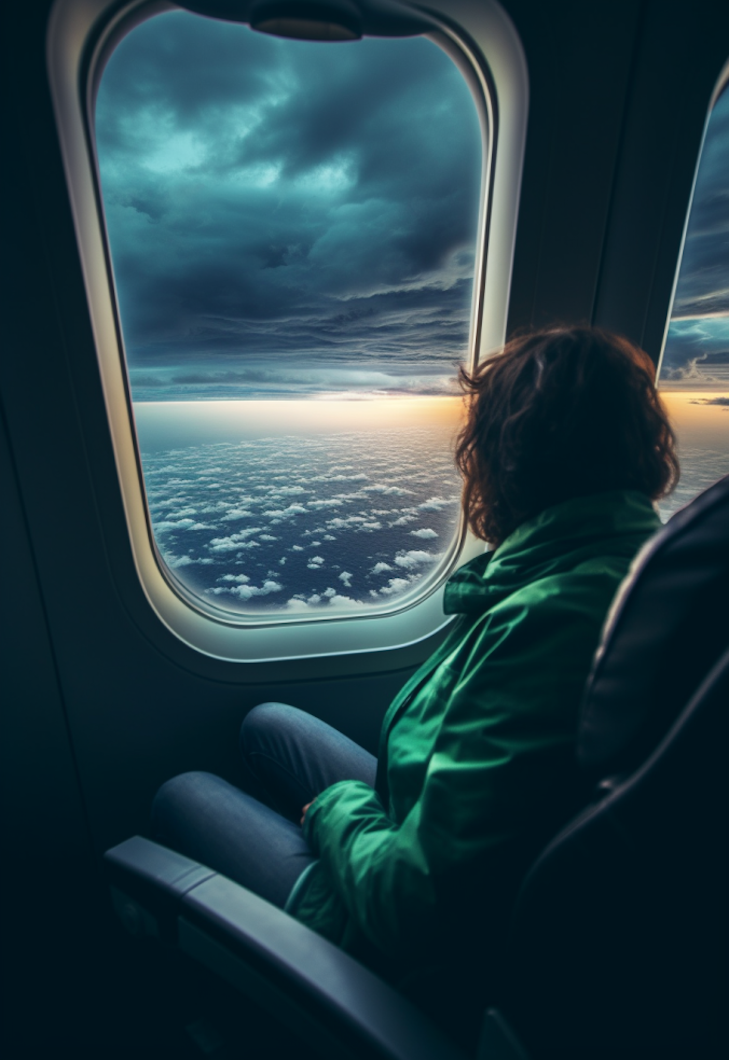 Person in green jacket gazes out airplane window at dramatic clouds and sunset hues, capturing a serene and contemplative moment.