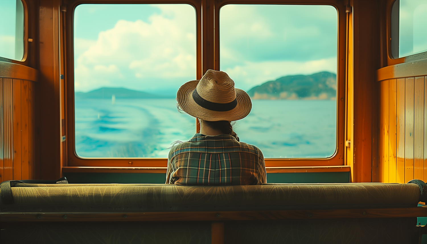 Person in a straw hat on a boat, gazing at the sea through large windows, with a serene view of water and distant mountains.