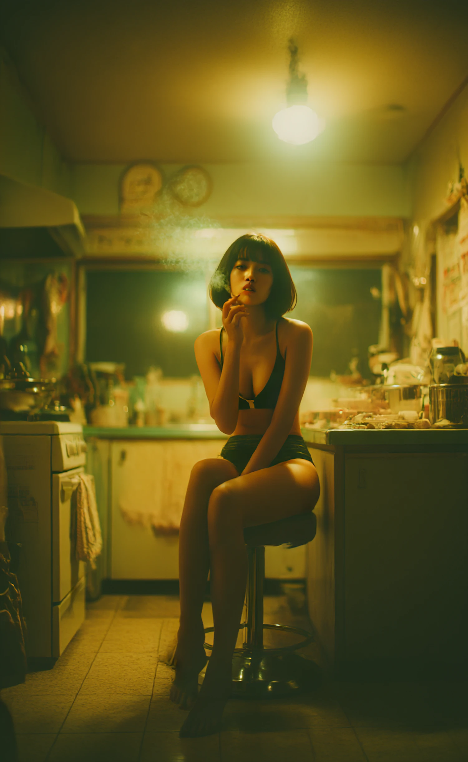 A moody, dimly lit kitchen scene featuring a woman seated on a stool, creating a vintage and contemplative atmosphere.