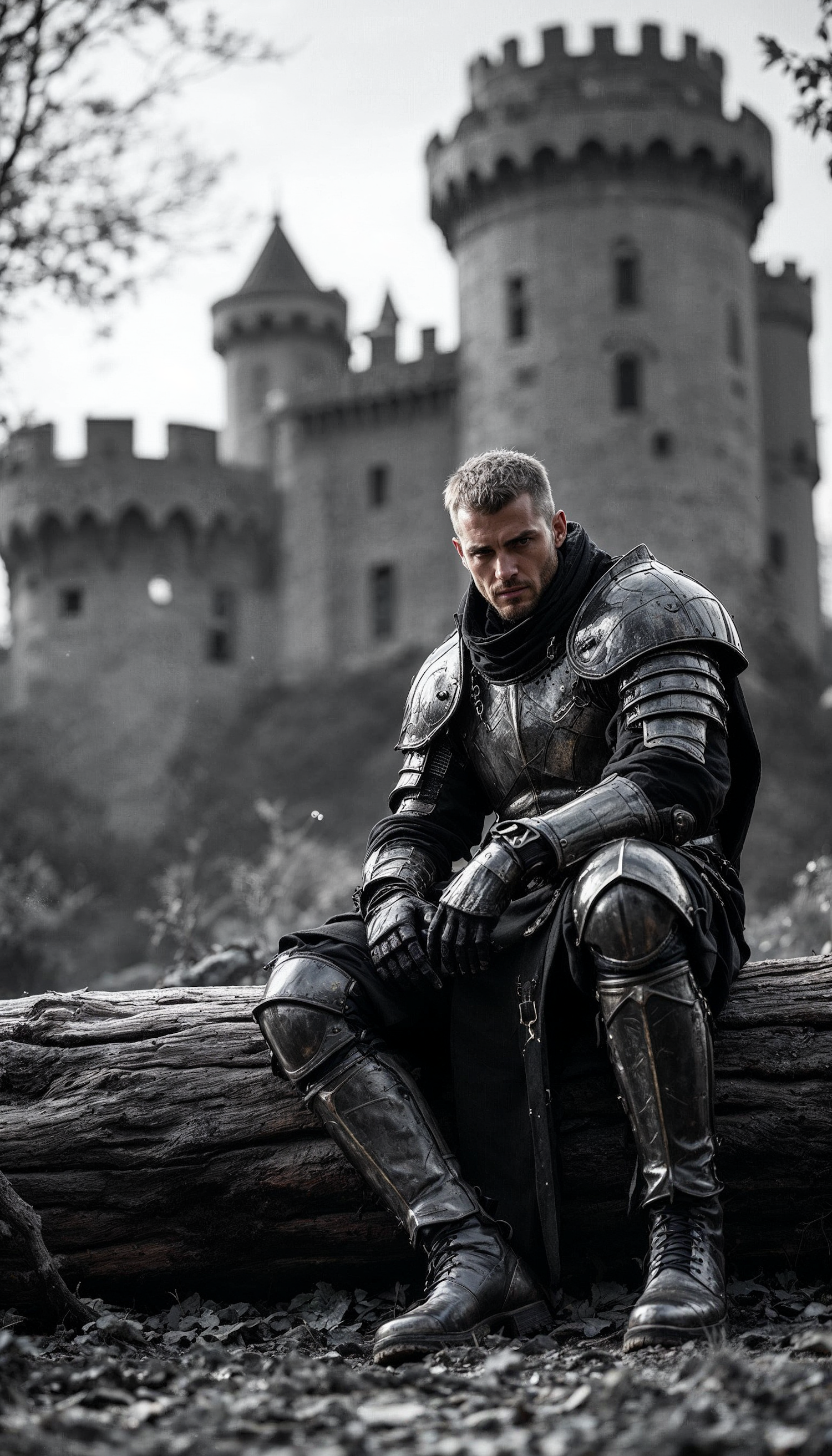 A knight in full armor sits solemnly in front of a medieval castle, exuding strength and history in a muted, rustic setting.