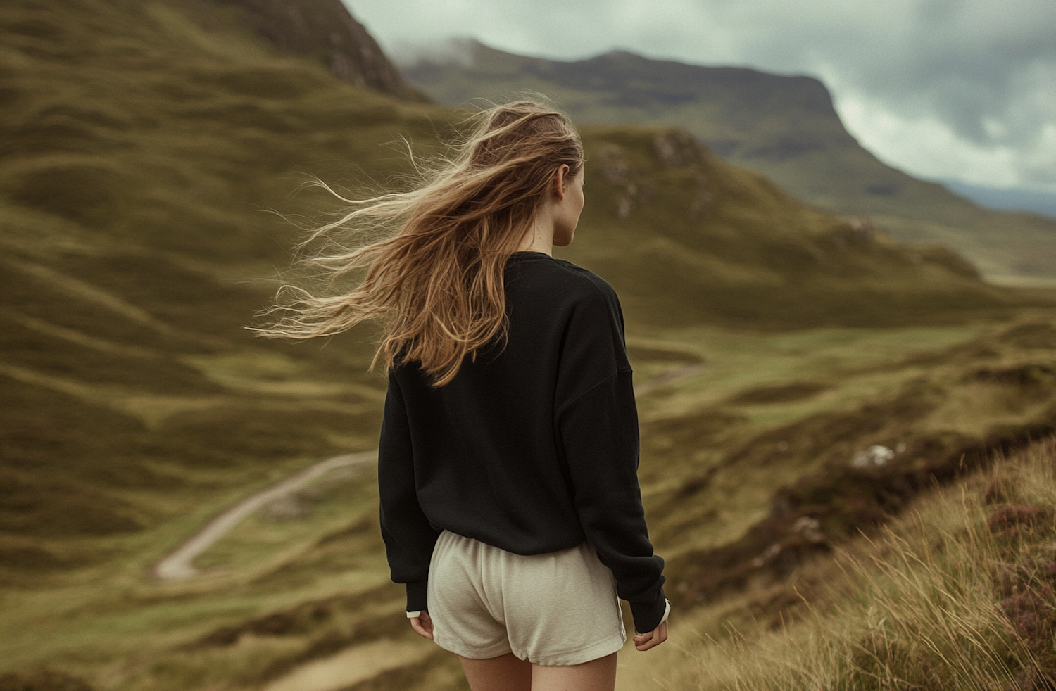 Woman with flowing hair stands in a serene, rolling landscape, wearing a black shirt and shorts. Overcast sky enhances the tranquil mood.