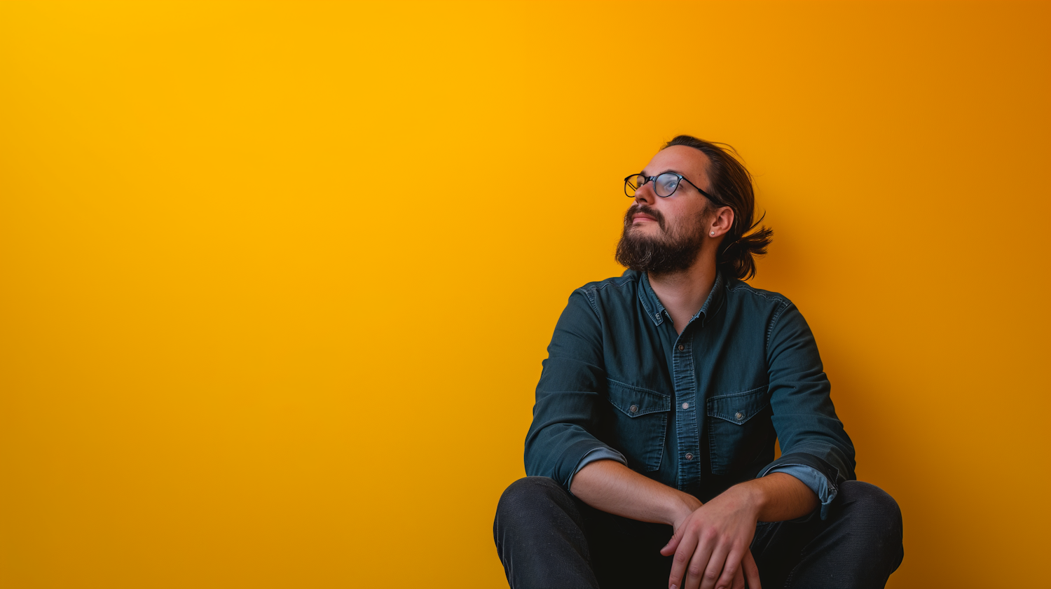 Man with glasses and beard in dark green shirt sits against a vibrant yellow background, looking contemplative.