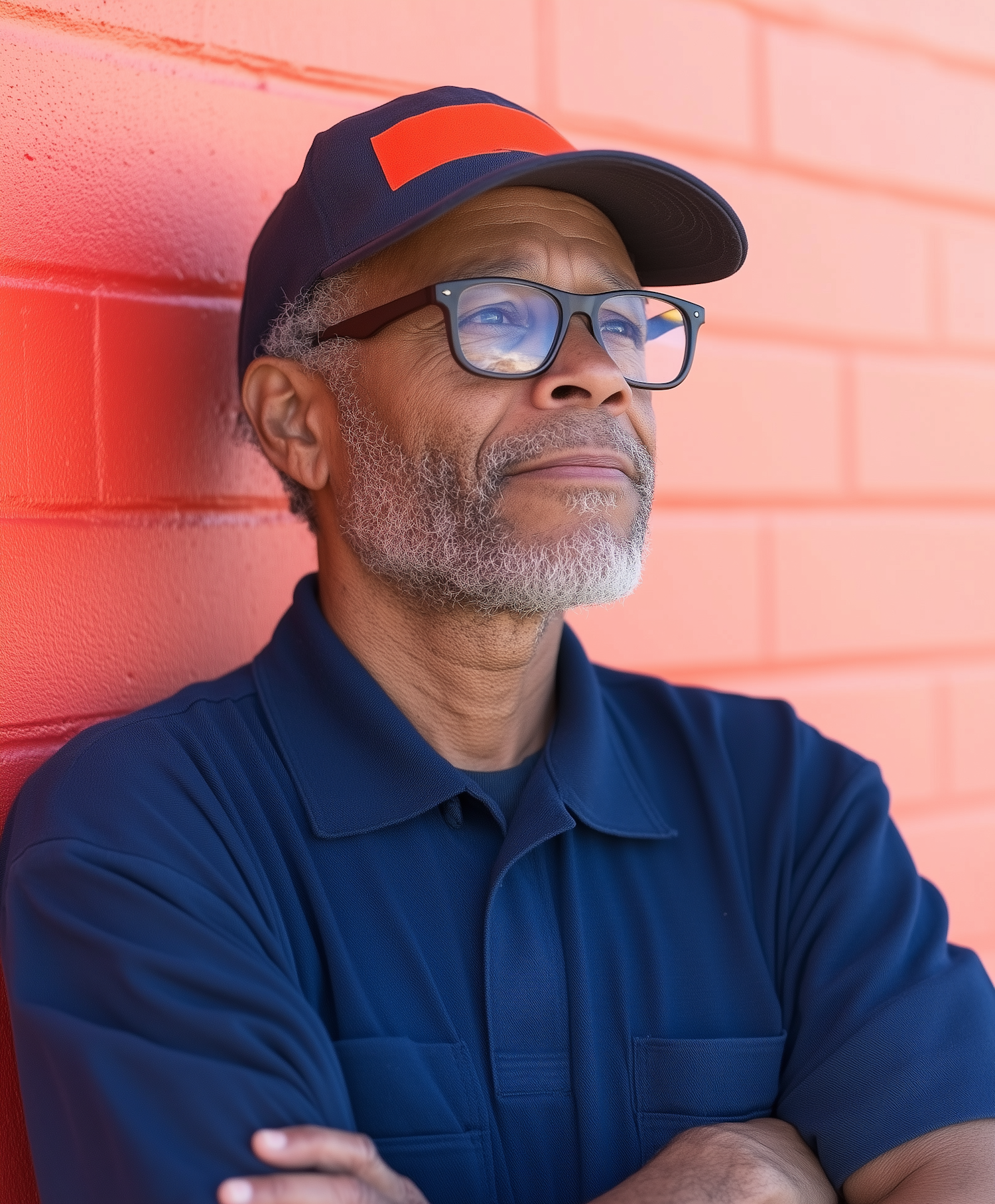 Thoughtful older man in navy uniform against vibrant orange wall, wearing glasses and cap. Striking color contrast and contemplative pose.