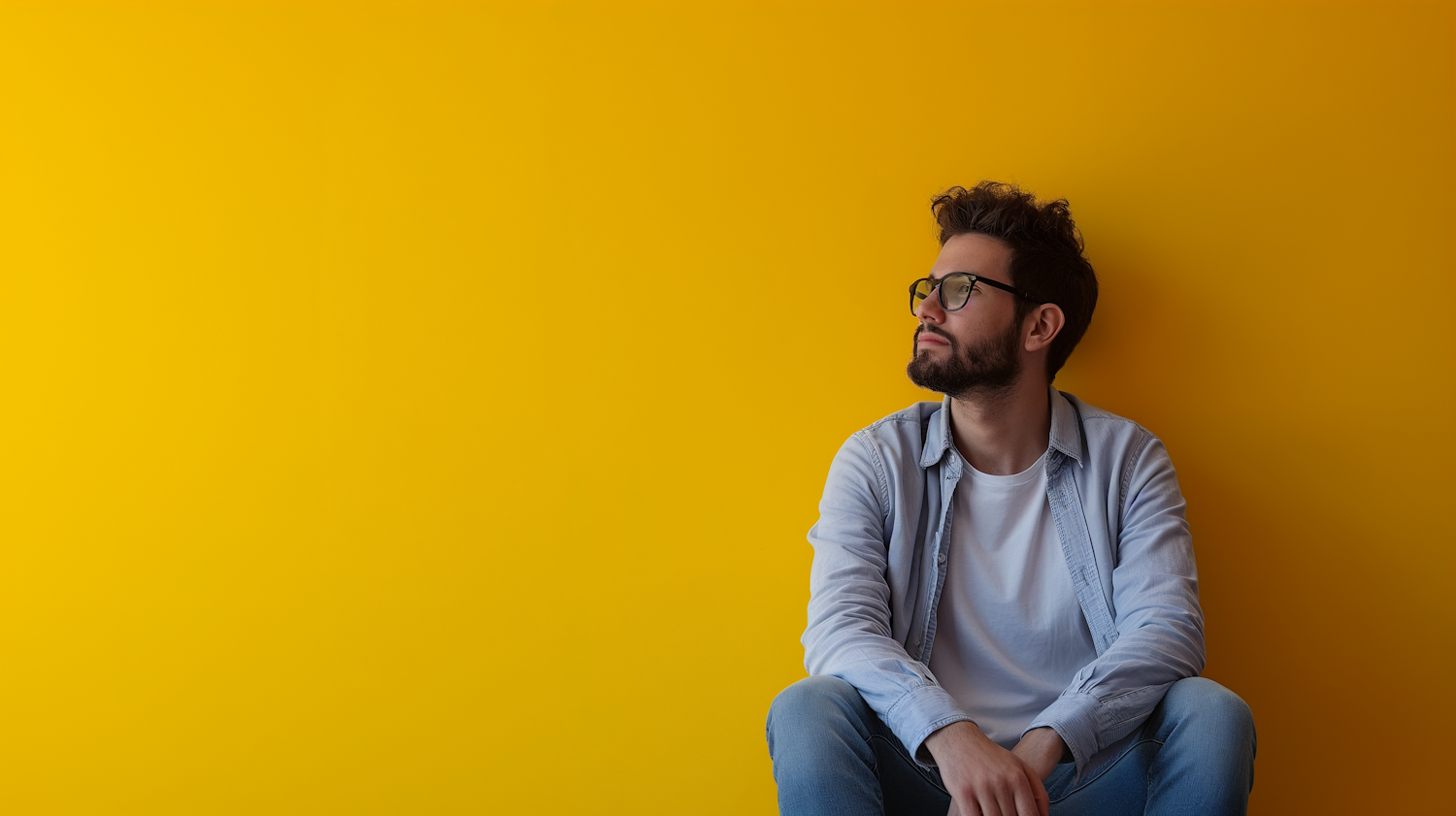Contemplative man with glasses against a vibrant yellow background, wearing a denim shirt and jeans, gazing thoughtfully upward.