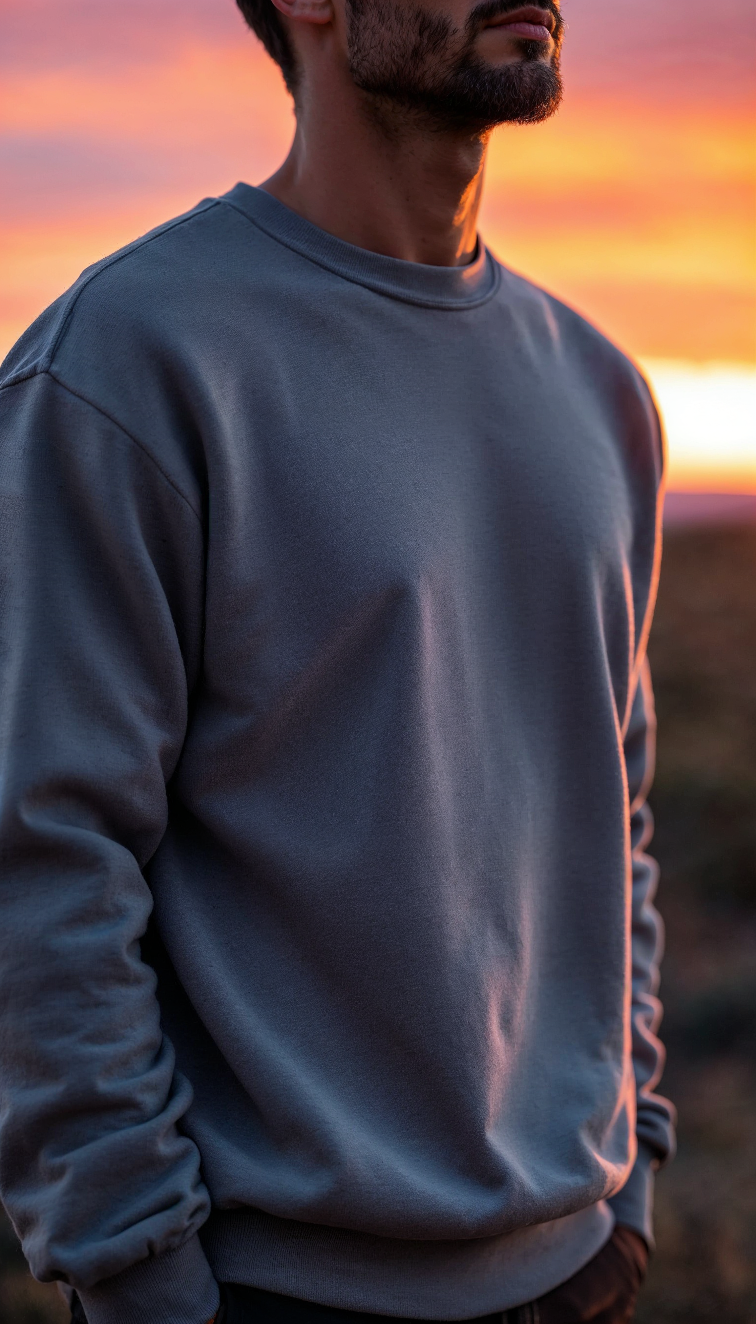Man in gray sweatshirt against a vibrant sunset, showcasing warm hues and a serene atmosphere.