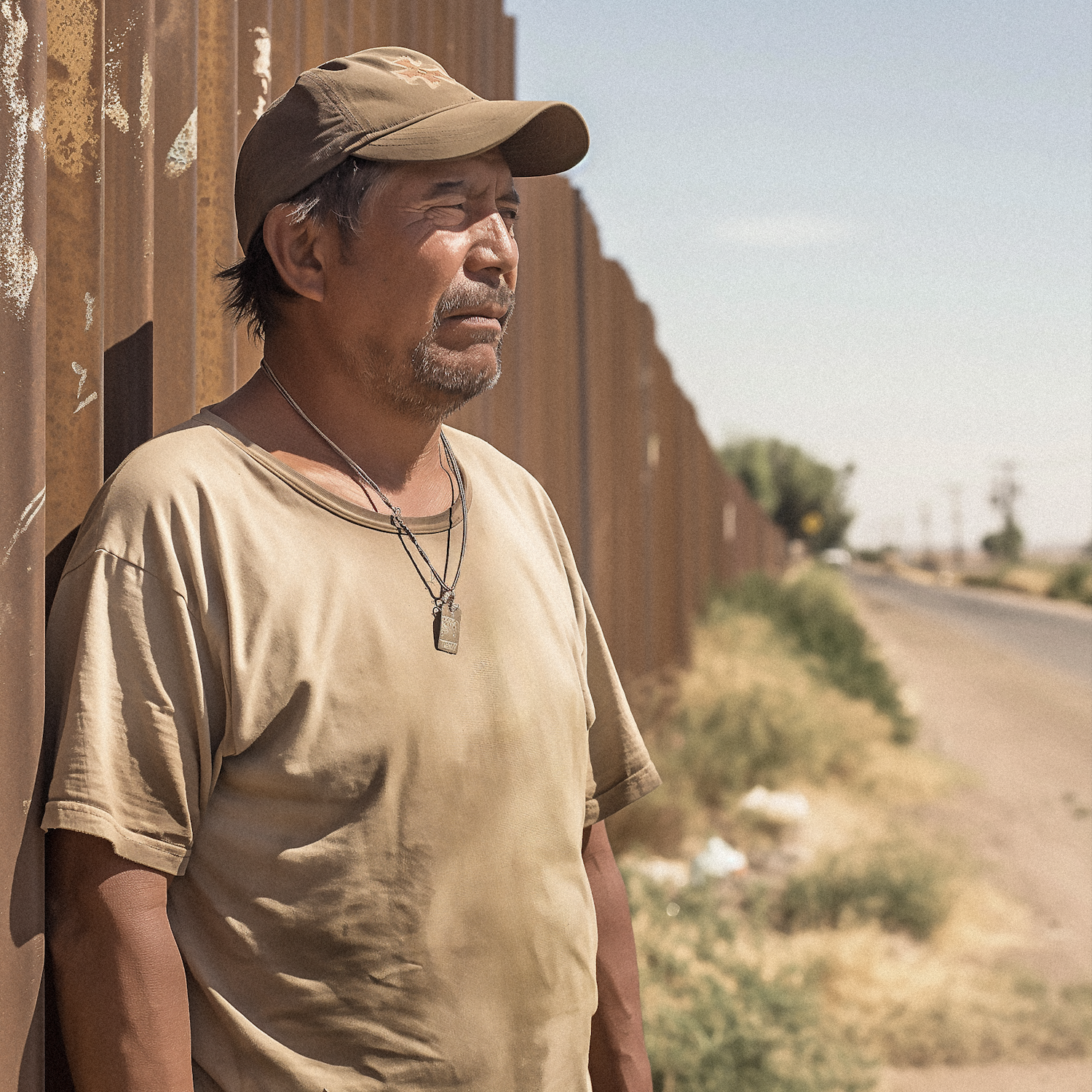 Middle-aged Asian man in a beige cap and t-shirt stands by a metal fence, looking contemplative in a sunny, arid landscape.