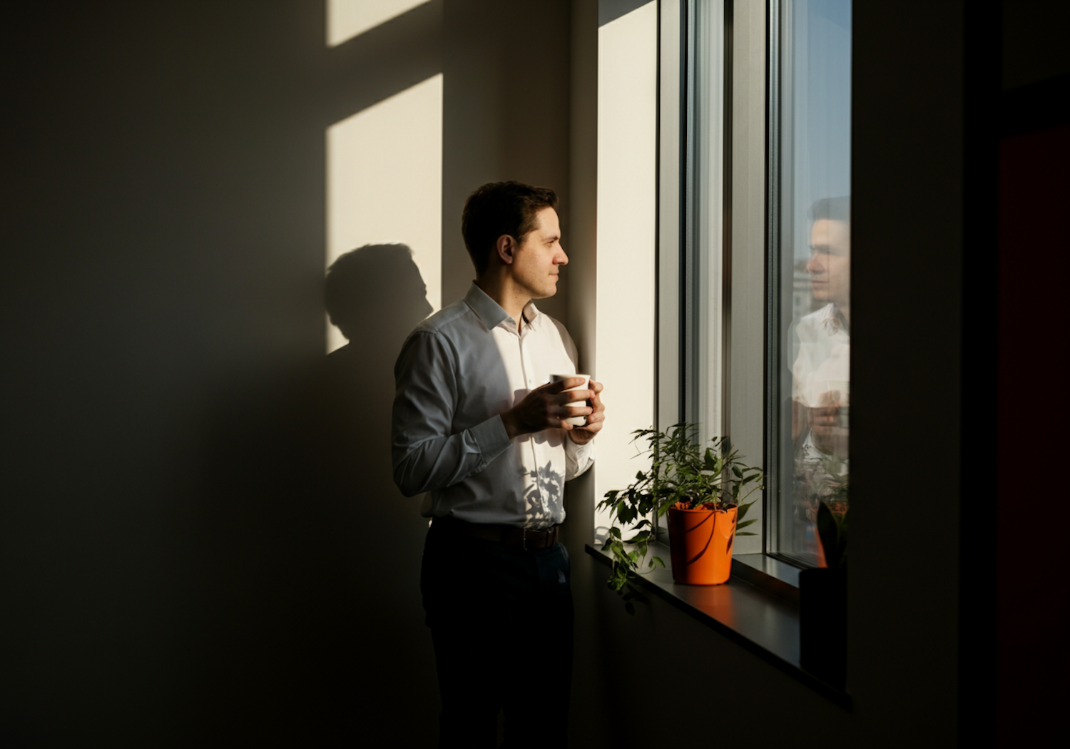 Man in light shirt holding mug, gazing out window with plant on sill, sunlight casting shadow on wall.