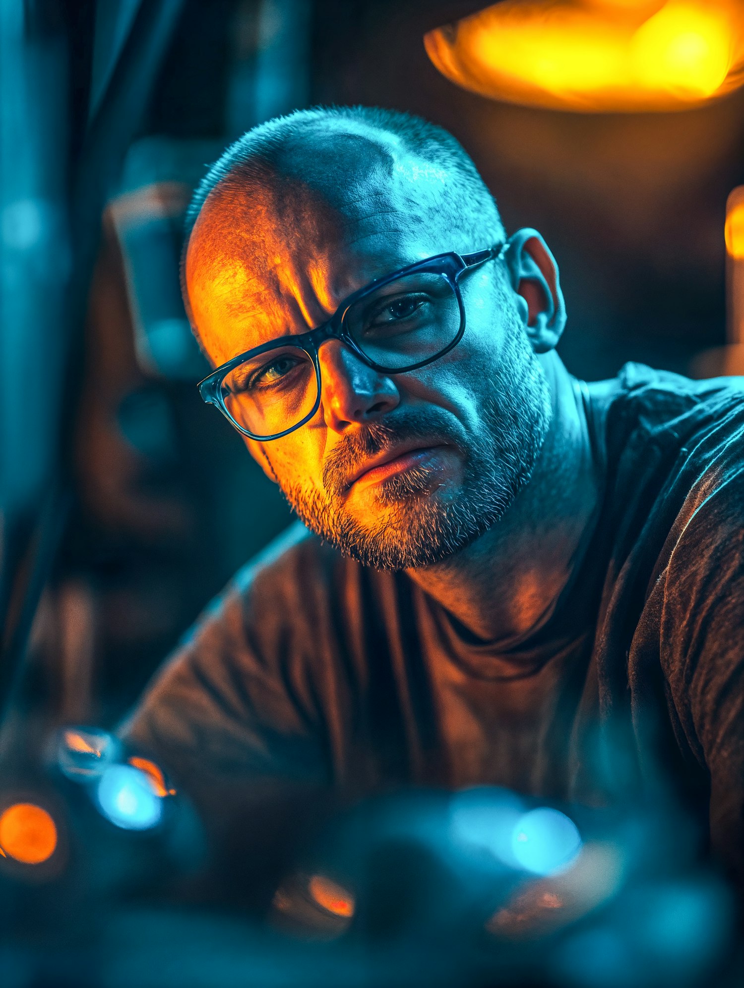 Close-up portrait of a man with glasses, dramatic lighting in orange and blue tones, serious expression.
