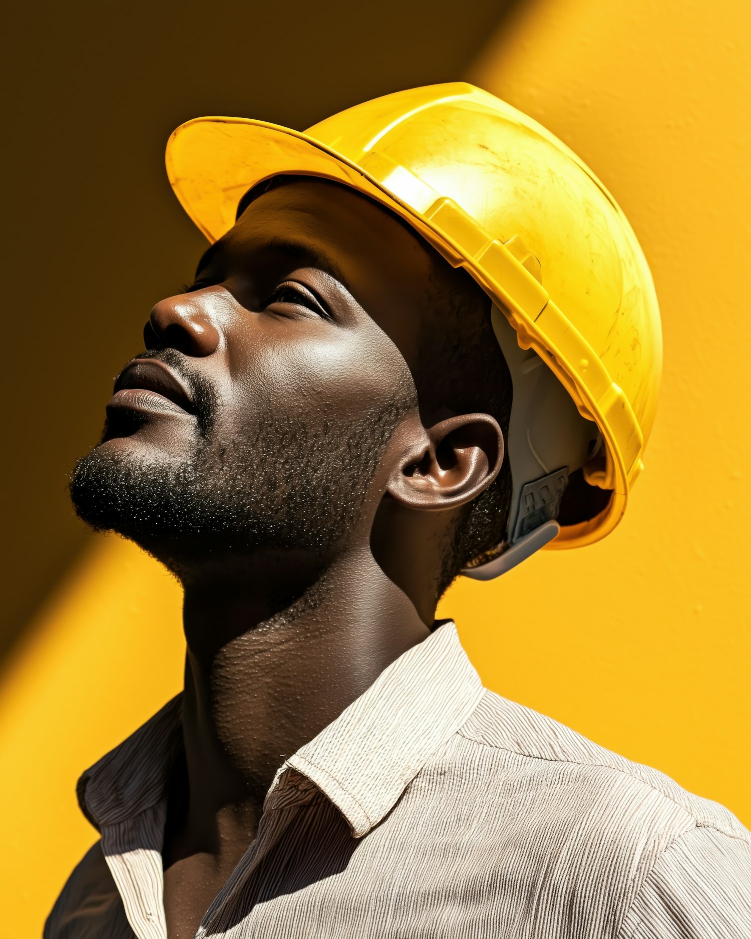Black man in yellow hard hat against matching background, eyes closed, serene expression, sunlight highlights his face.