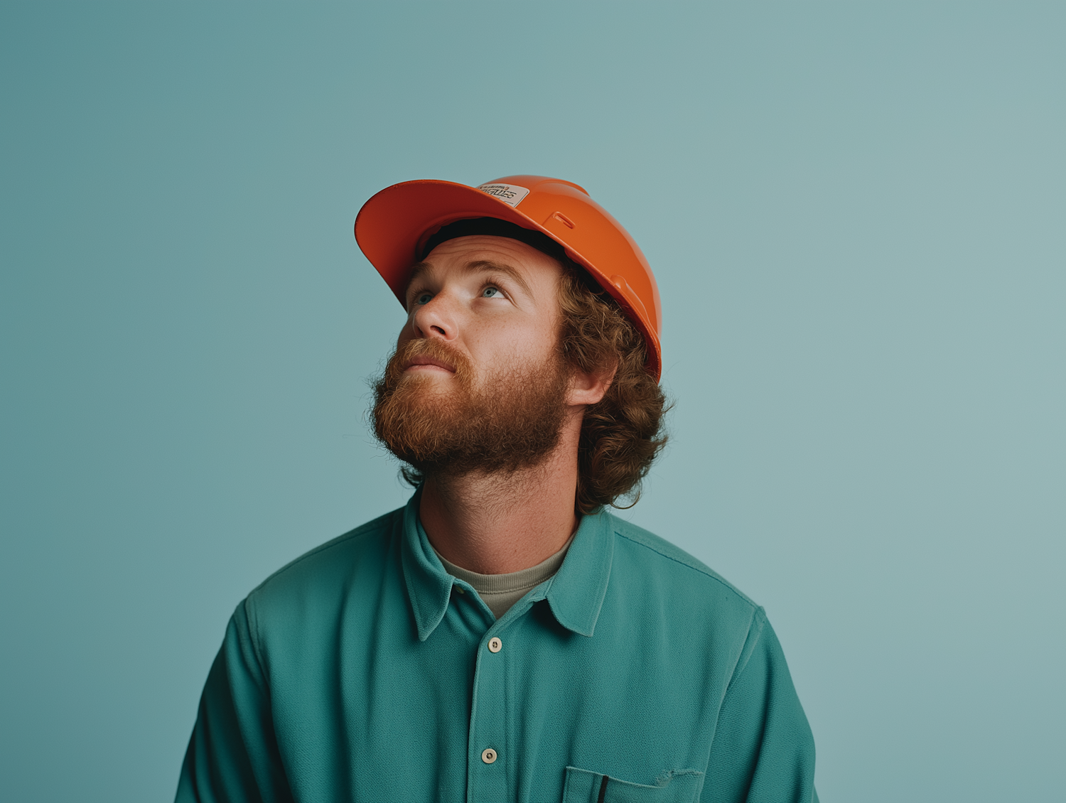 Man with orange hard hat and teal shirt gazes upward against a light teal background, evoking a sense of focus and contemplation.
