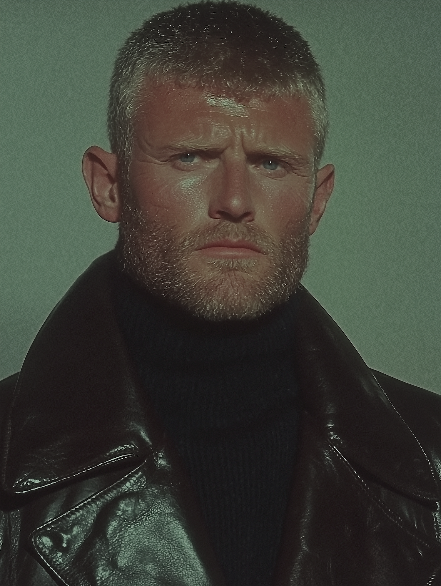 Rugged man with short hair and stubble in a leather jacket, exuding a serious expression and strong features.