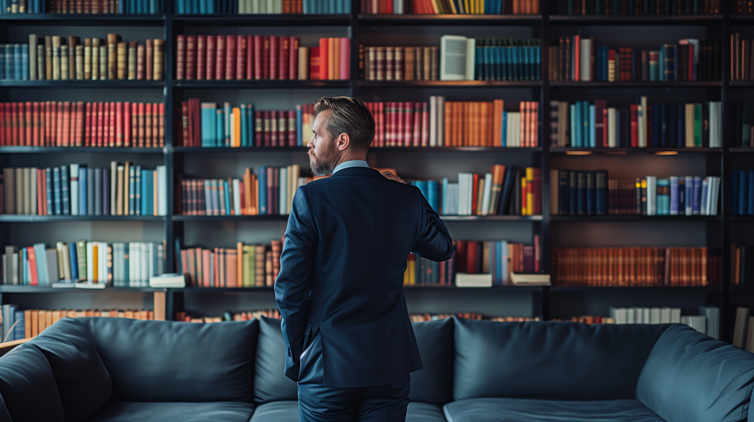 Man in a dark blue suit stands in a stylish library with colorful books and a plush sofa, creating an elegant atmosphere.