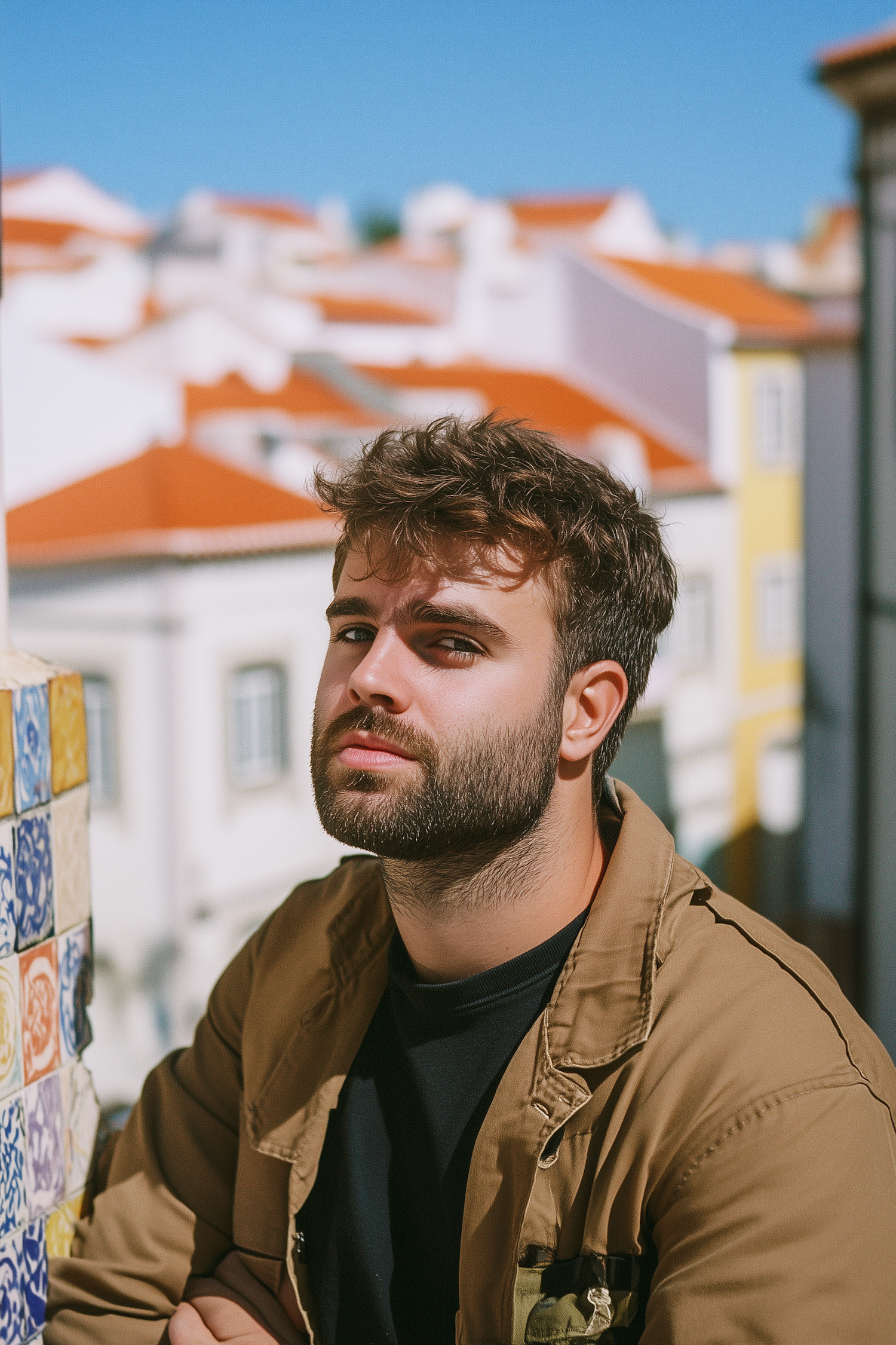 Stylish man with a beard and tan jacket in a sunny Mediterranean setting with orange rooftops and colorful tiles.