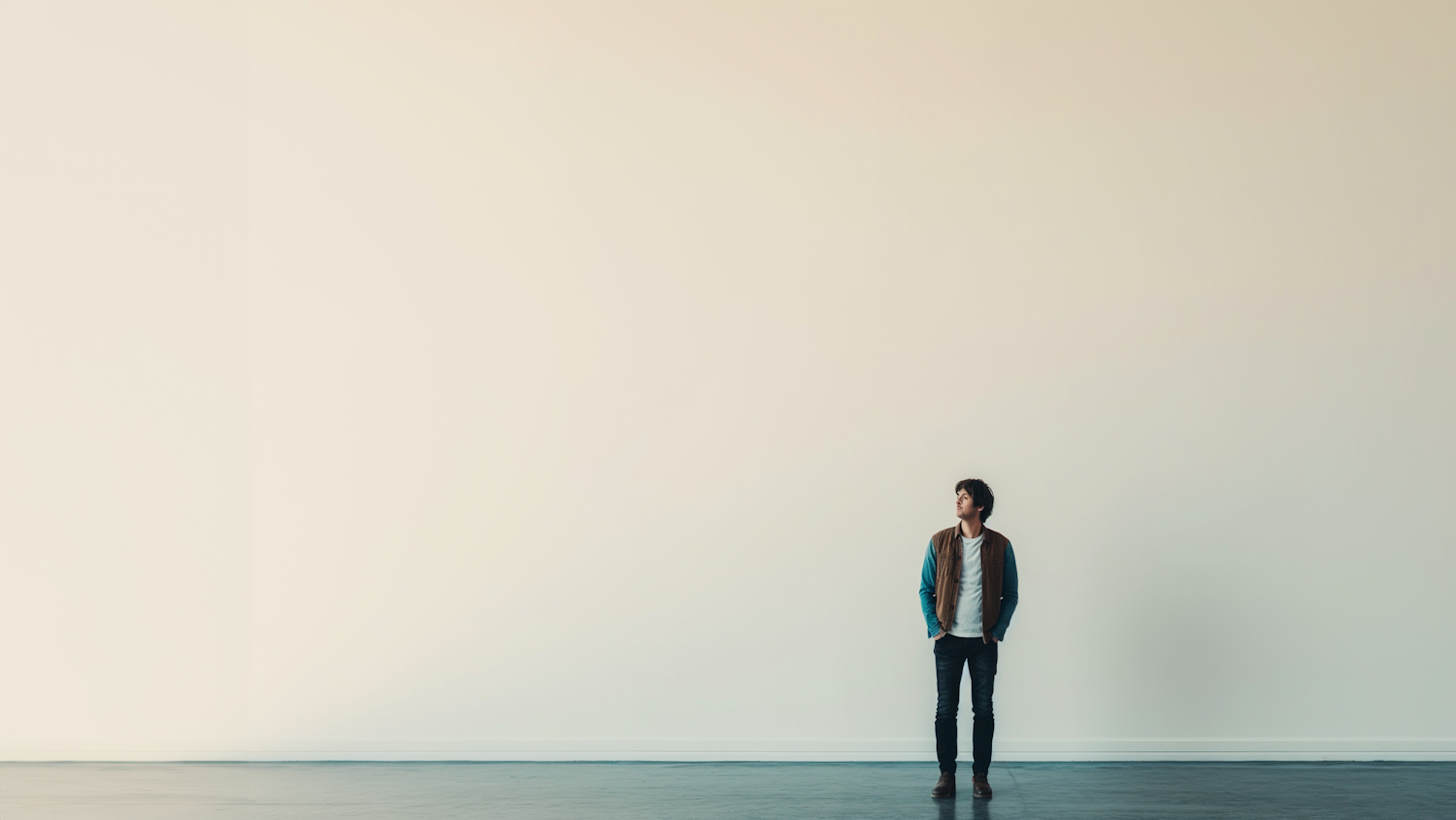 Young man in a minimalist room with off-white walls, wearing a brown jacket and jeans, gazing thoughtfully. Spacious and serene setting.