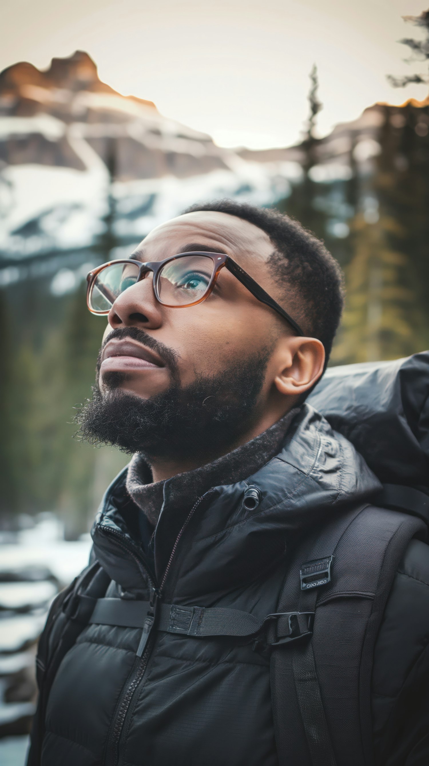 Man with glasses and backpack gazes at snow-capped mountains, wearing a black jacket. Outdoor adventure in a serene, cold setting.