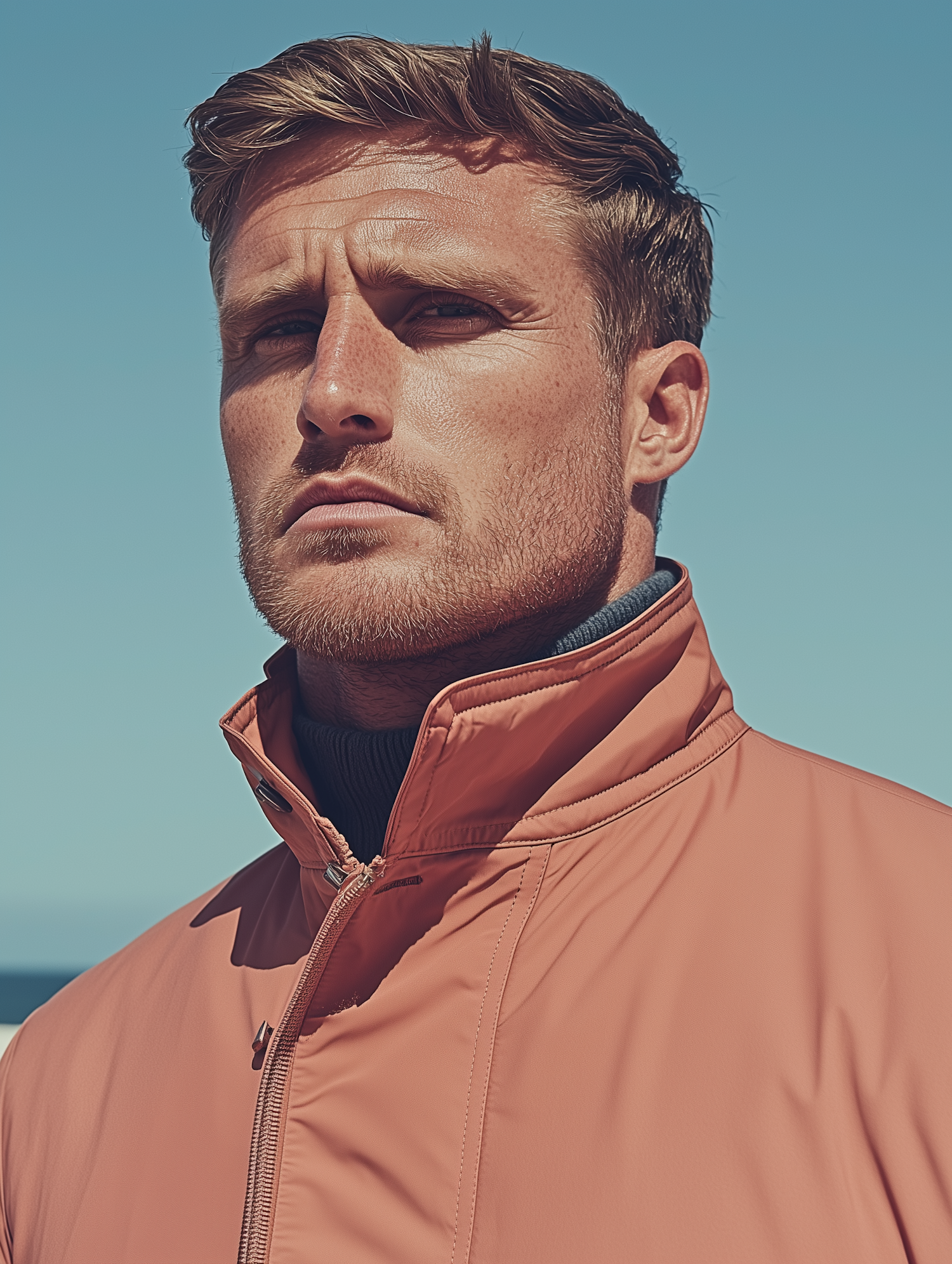 Caucasian man with light brown hair in a salmon jacket against a blue sky, looking serious and contemplative.