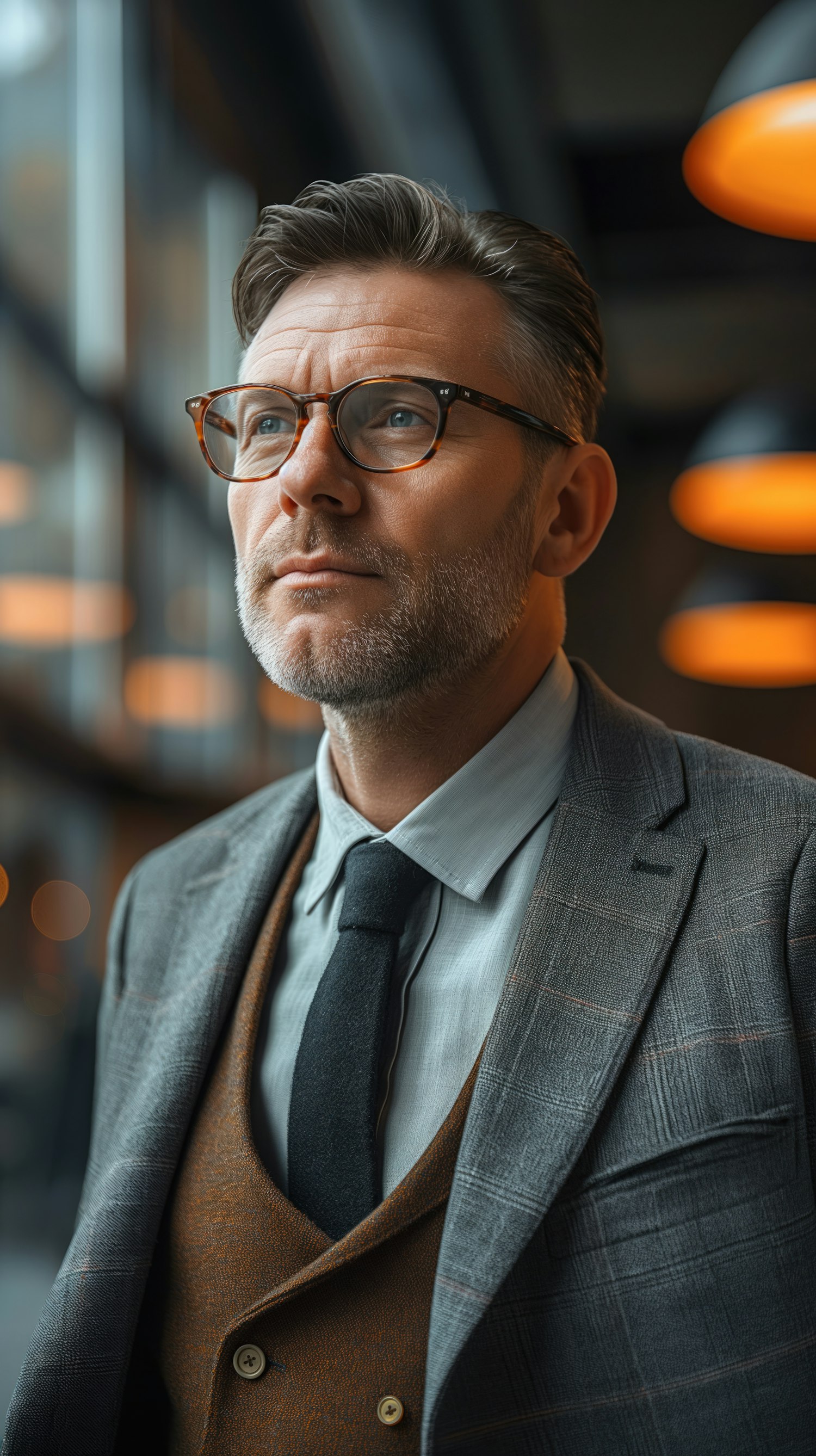 Stylish man in glasses and suit, gazing thoughtfully in a modern interior with warm lighting.