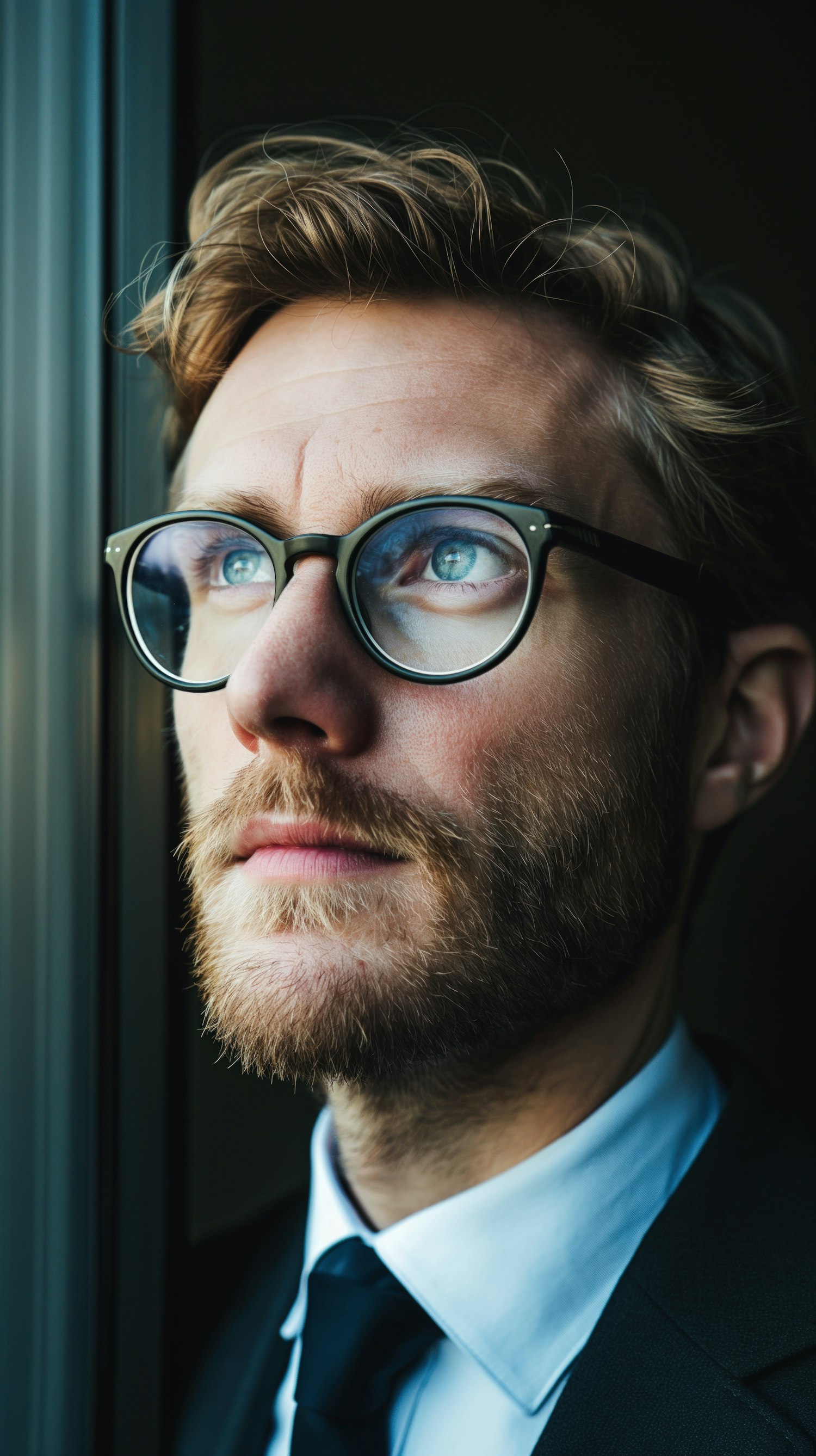 Thoughtful man with glasses in a suit gazing out a window, highlighting his contemplative expression and professional attire.