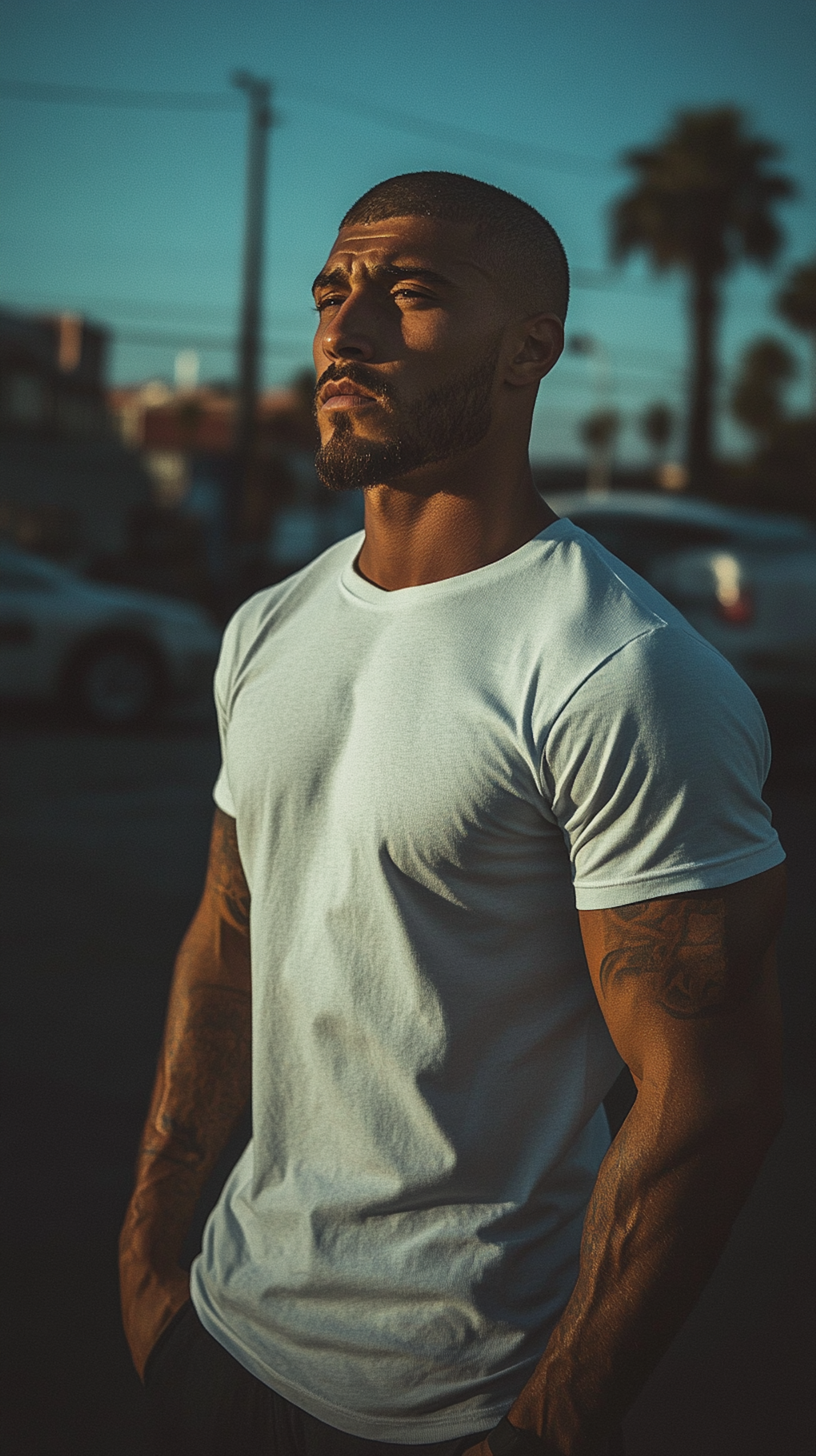 Muscular man in white t-shirt during golden hour, with tattoos and urban background, exuding confidence and style.