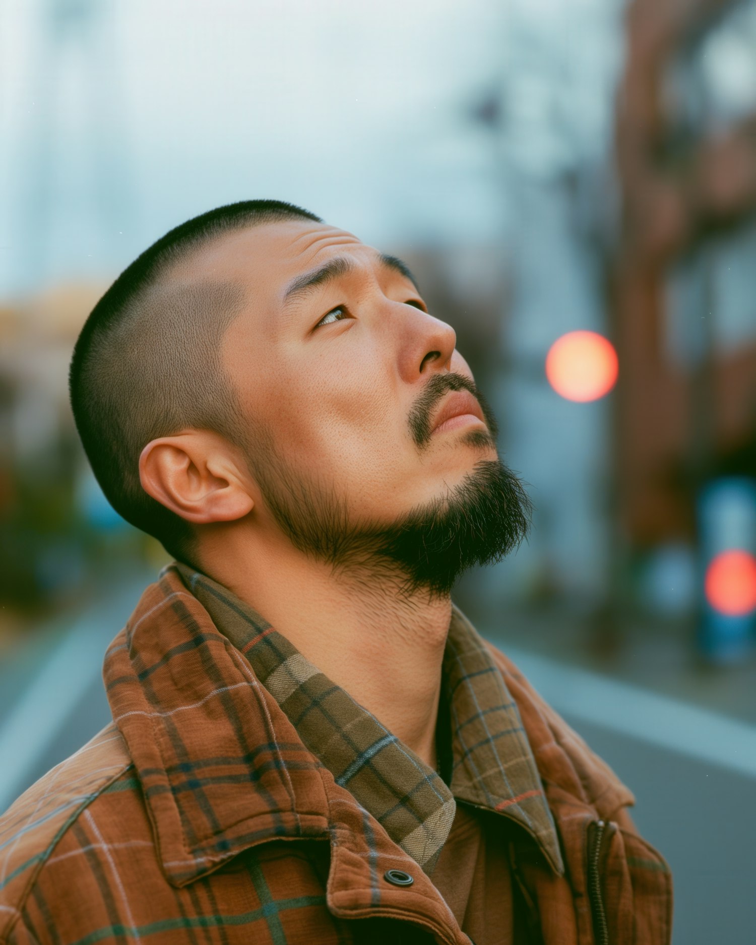 Asian man with shaved head and beard looks up contemplatively, wearing a brown plaid jacket in an urban setting.