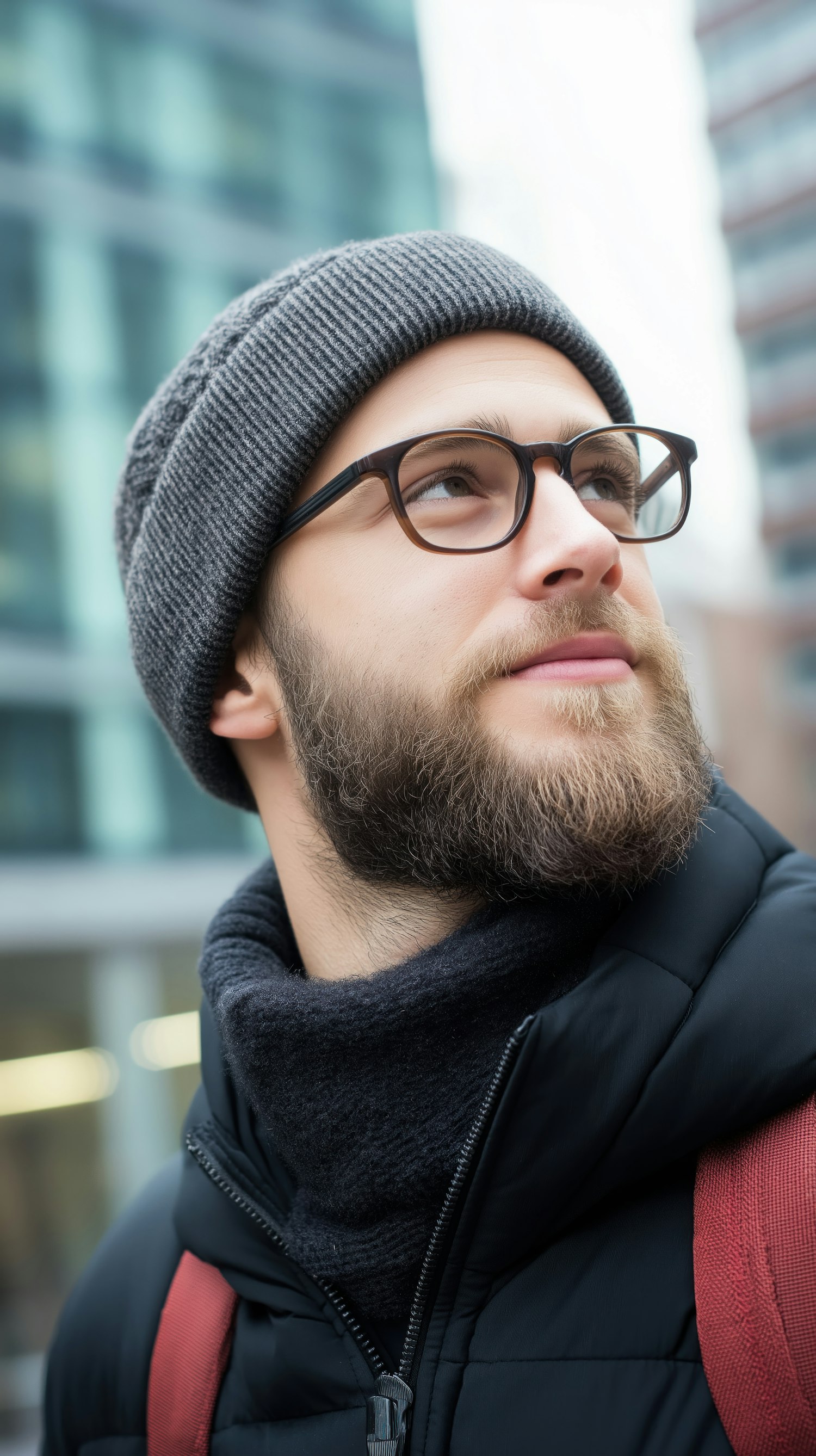 Young man with beard and glasses in urban setting, wearing a gray beanie and black jacket, looking thoughtfully upwards.